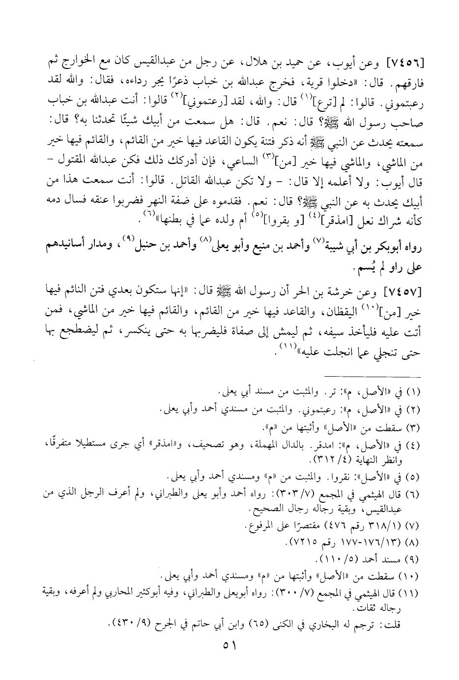 7456 - وعن أيوب، عن حميد بن هلال، عن رجل من عبد القيس كان مع الخوارج ثم فارقهم. قال: "دخلوا قرية، فخرج عبد الله بن خباب ذعرًا يجر رداءه، فقال: والله لقد رعبتموني. قالوا: لم ترع قال: والله، لقد رعتموني قالوا: أنت عبد الله بن خباب صَاحِبَ رَسُولِ اللَّهِ - صَلَّى اللَّهُ عَلَيْهِ وَسَلَّمَ -؟ قال: نعم. قال: هل سمعت من أبيك شيئًا تحدثنا به؟ قال: سمعته يُحَدِّثُ عَنِ النَّبِيِّ - صَلَّى اللَّهُ عَلَيْهِ وَسَلَّمَ -أَنَّهُ ذكر فتنة يكون الْقَاعِدُ فِيهَا خَيْرٌ مِنَ الْقَائِمِ، وَالْقَائِمُ فِيهَا خَيْرٌ مِنَ الْمَاشِي، وَالْمَاشِي فِيهَا خَيْرٌ مِنَ الساعي، فإن أدركك ذلك فكن عبد الله المقتول- قال أيوب: ولا أعلمه إلا قال: - ولا تكن عبد الله القاتل. قالوا: أنت سمعت هذا من أبيك يحدث بِهِ عَنِ النَّبِيِّ - صَلَّى اللَّهُ عَلَيْهِ وَسَلَّمَ -قَالَ: نعم. فقدموه على ضفة النهر فضربوا عنقه فسال دمه كأنه شراك نعل امذقر، وبقروا أم ولده عما في بطنها".