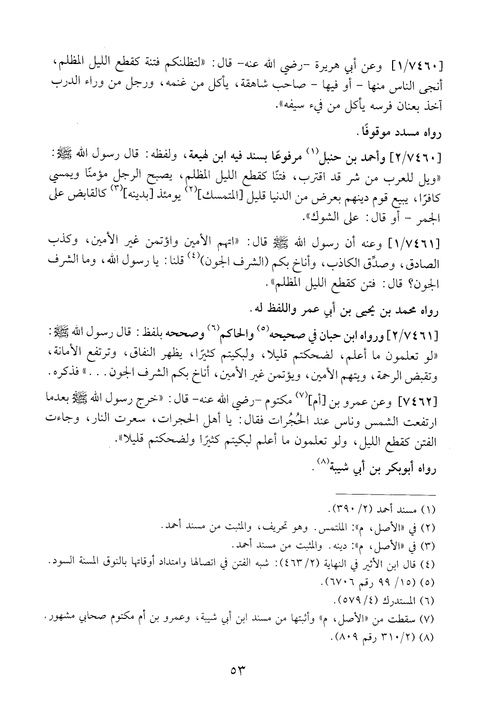 7461 / 1 - وَعَنْهُ أَنَّ رَسُولَ اللَّهِ - صَلَّى اللَّهُ عَلَيْهِ وسلم - قال: "اتهم الأمين واؤتمن غَيْرُ الْأَمِينِ، وَكَذِّبَ الصَّادِقُ، وصدِّق الْكَاذِبُ، وَأَنَاخَ بكم (الشرف الجون) قلنا: يا رسول الله، وما الشرف الجون؟ قَالَ: فِتَنٌ كَقِطَعِ اللَّيْلِ الْمُظْلِمِ".