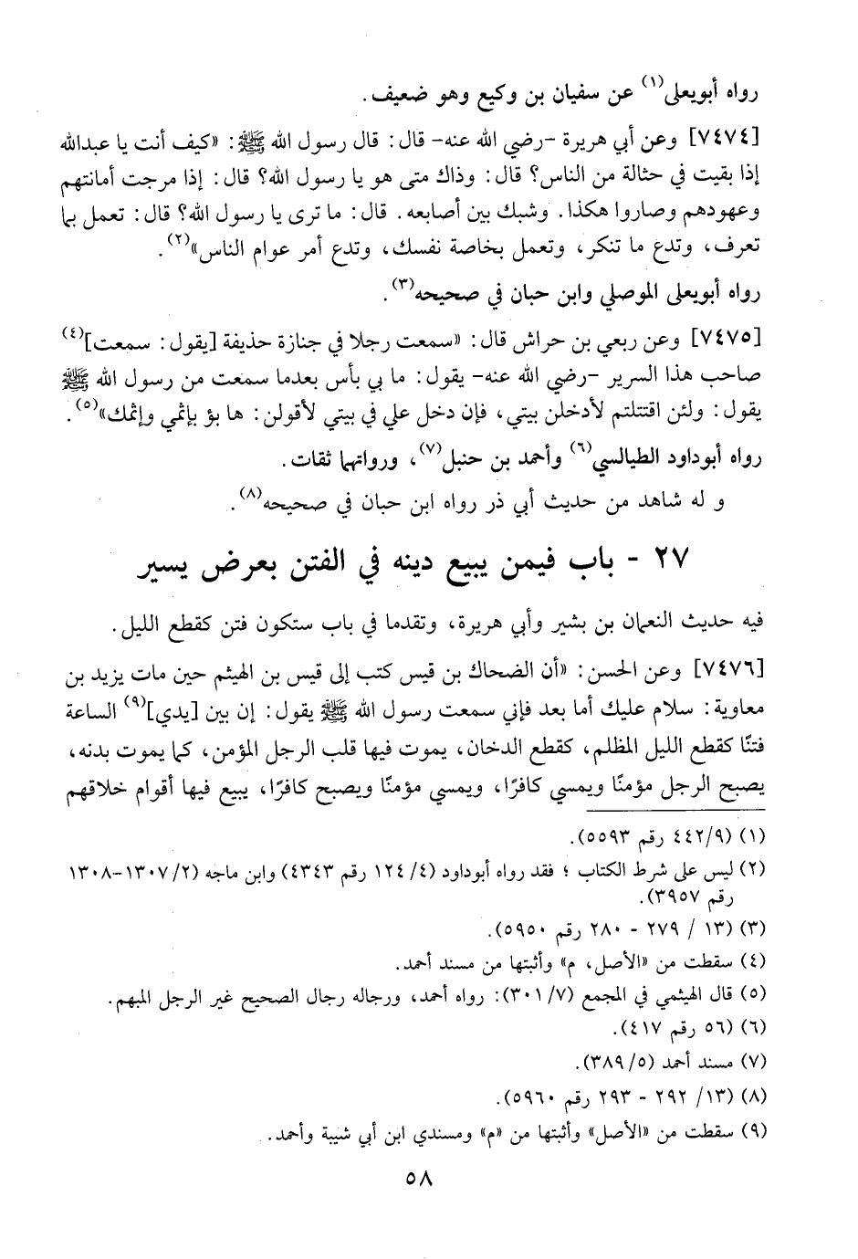 7475 - وَعَنْ رِبْعِيِّ بْنِ حِرَاشٍ قَالَ: "سَمِعْتُ رَجُلًا فِي جنازة حذيفة يقول: سمعت، صَاحِبِ هَذَا السَّرِيرِ- رَضِيَ اللَّهُ عَنْهُ- يَقُولُ: ما بي بأس بعدما سَمِعْتَ مِنْ رَسُولِ اللَّهِ- صَلَّى اللَّهُ عَلَيْهِ وَسَلَّمَ - يَقُولُ: وَلَئِنِ اقْتَتَلْتُمْ لَأَدْخُلَنَّ بَيْتِي، فَإِنْ دُخِلَ عَلَيَّ فِي بَيْتِي لَأَقُولَنَّ: هَا بُؤْ بِإِثْمِي وَإِثْمِكَ". رَوَاهُ أَبُو دَاوُدَ الطَّيَالِسِيُّ وَأَحْمَدُ بْنُ حَنْبَلٍ، ورواتهما ثقات.