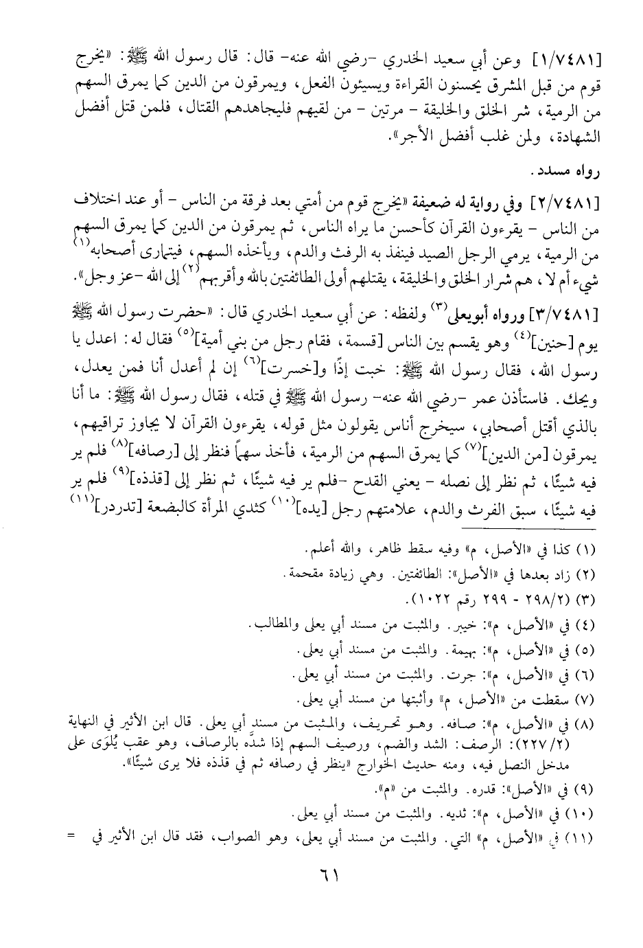 7481 / 3 - وَرَوَاهُ أَبُو يَعْلَى وَلَفْظُهُ: عَنْ أَبِي سَعِيدٍ الْخُدْرِيِّ قَالَ: "حَضَرْتُ رَسُولَ اللَّهِ - صَلَّى اللَّهُ عَلَيْهِ وَسَلَّمَ -يَوْمَ حنين، وهو يقسم بين الناس قسمة، فقام رجل من بني أمية فقال له: اعْدِلْ يَا رَسُولُ اللَّهِ، فَقَالَ رَسُولُ اللَّهِ - صَلَّى اللَّهُ عَلَيْهِ وَسَلَّمَ -: خِبْتَ إِذًا وَخَسِرْتَ إن لا أعدل أنا فَمَنْ يَعْدِلَ، وَيْحَكَ. فَاسْتَأْذَنَ عُمَرُ- رَضِيَ اللَّهُ عَنْهُ- رَسُولَ اللَّهِ - صَلَّى اللَّهُ عَلَيْهِ وَسَلَّمَ - فِي قَتْلِهِ، فَقَالَ رَسُولُ اللَّهِ - صَلَّى اللَّهُ عَلَيْهِ وَسَلَّمَ -: مَا أَنَا بِالَّذِي أَقْتُلُ أَصْحَابِي، سَيَخْرُجُ أُنَاسٌ يَقُولُونَ مِثْلَ قَوْلِهِ، يَقْرَءُونَ الْقُرْآنَ لَا يُجَاوِزُ تَرَاقِيَهُمْ، يَمْرُقُونَ مِنَ الدِّينِ كَمَا يمرق السهم من الرمية، فأخذ سهل فَنَظَرَ إِلَى رِصَافِهِ فَلَمْ يَرَ فِيهِ شَيْئًا، ثُمَّ نَظَرَ إِلَى نَصْلِهِ- يَعْنِي الْقَدَحَ- فَلَمْ يَرَ فِيهِ شَيْئًا، ثُمَّ نَظَرَ إِلَى قَذَذِهِ فَلَمْ يَرَ فِيهِ شَيْئًا، سَبَقَ الْفَرْثَ وَالدَّمَ، عَلَامَتُهُمْ رَجُلٌ يَدُهُ كَثَدْيِ الْمَرْأَةِ كَالْبُضْعَةِ تُدَرْدِرُ