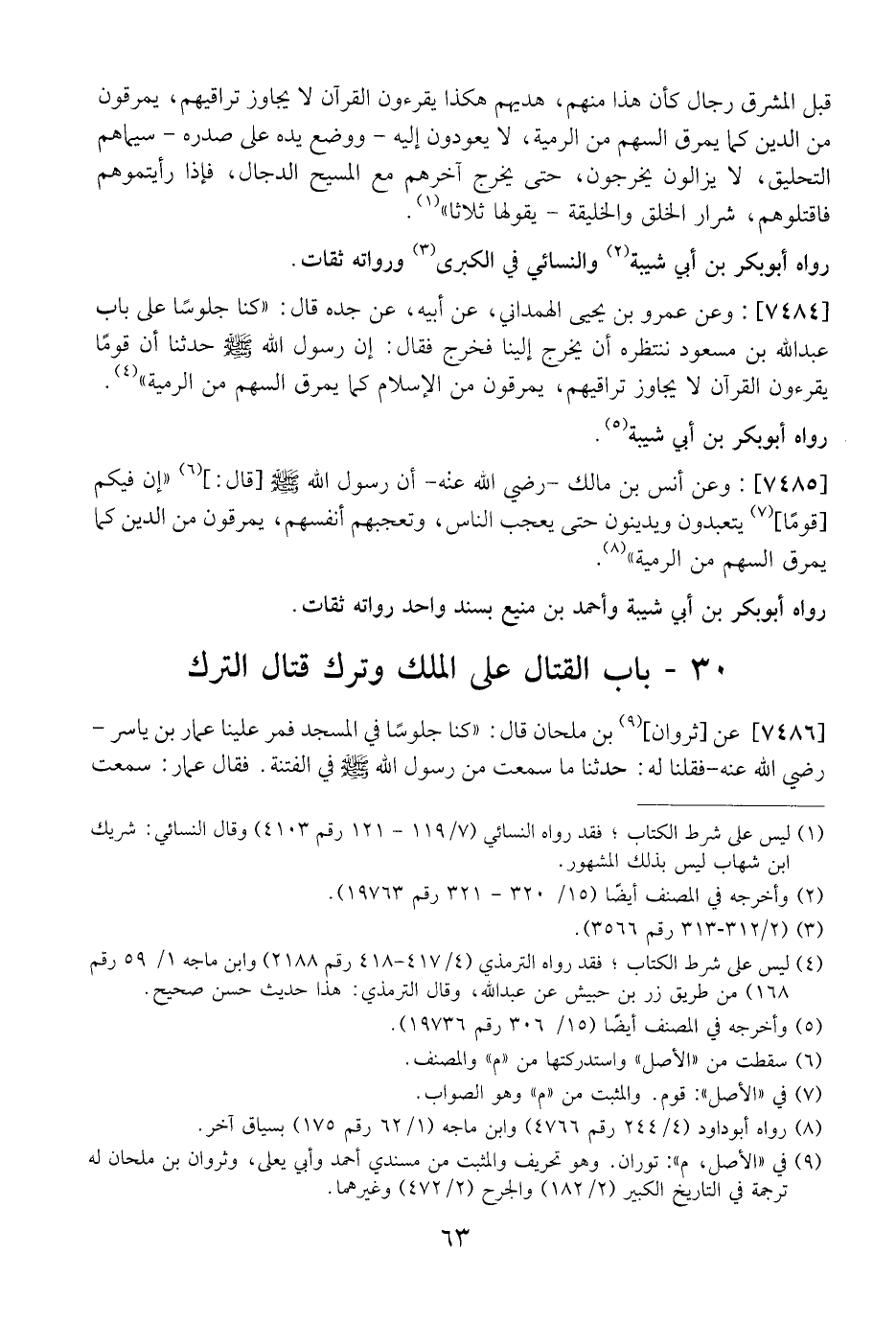 7486 - عَنْ ثَرْوَانَ بن ملحان قالت: "كُنَّا جُلُوسًا فِي الْمَسْجِدِ فَمَرَّ عَلَيْنَا عَمَّارُ بْنُ يَاسِرٍ- رَضِيَ اللَّهُ عَنْهُ- فَقُلْنَا لَهُ: حَدِّثْنَا مَا سَمِعْتَ مِنْ رَسُولِ اللَّهِ - صَلَّى اللَّهُ عَلَيْهِ وَسَلَّمَ - فِي الْفِتْنَةِ. فَقَالَ عَمَّارٌ: سمعت
