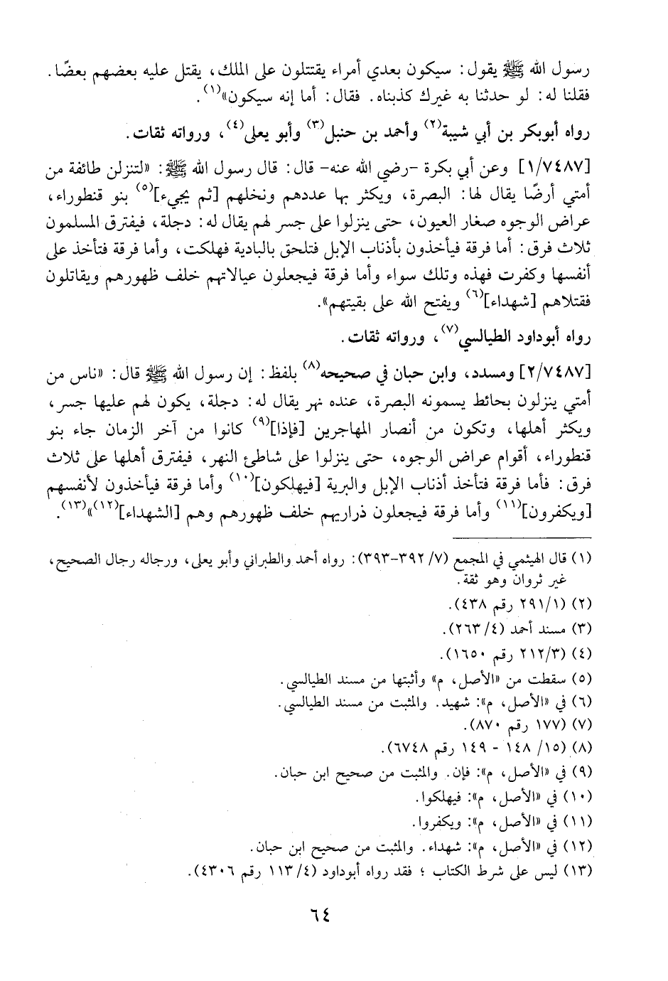 7487 / 2 - وَمُسَدَّدٌ، وَابْنُ حِبَّانَ فِي صَحِيحِهِ بِلَفْظِ: إِنَّ رَسُولَ اللَّهِ - صَلَّى اللَّهُ عَلَيْهِ وسلم - قَالَ: "نَاسٌ مِنْ أُمَّتِي يَنْزِلُونَ بِحَائِطٍ يُسَمُّونَهُ الْبَصْرَةَ، عِنْدَهُ نَهْرٌ يُقَالُ لَهُ: دِجْلَةُ، يَكُونُ لَهُمْ عَلَيْهَا جِسْرٌ، وَيَكْثُرُ أَهْلُهَا، وَتَكُونُ مِنْ أنصار المهاجرين فإذا كَانُوا مِنْ آخِرِ الزَّمَانِ جَاءَ بَنُو قَنْطُورَاءَ، أقوام عراض الوجوه، حتى ينزلوا على شاطىء النَّهْرِ، فَيَفْتَرِقُ أَهْلُهَا عَلَى ثَلَاثِ فِرَقٍ: فَأَمَّا فرقة فتأخذ أذناب الإبل والبرية فيهلكون وأما فرقة فيأخذون لأنفسهم ويكفرون وَأَمَّا فِرْقَةٌ فَيَجْعَلُونَ ذَرَارِيَهُمْ خَلْفَ ظُهُورِهِمْ وَهُمْ الشهداء