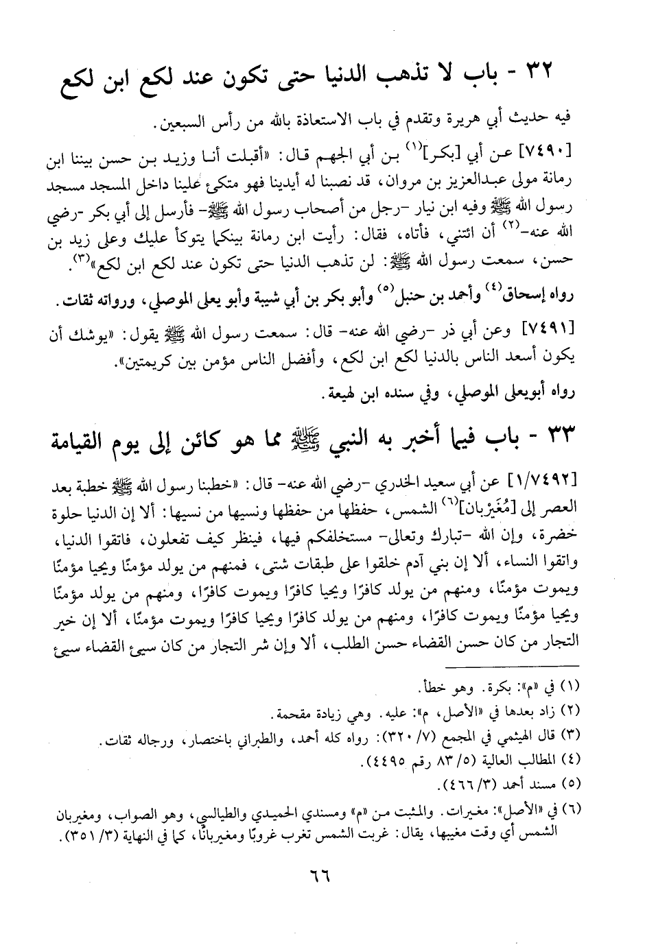 7490 - عَنْ أَبِي بَكْرِ بْنِ أَبِي الْجَهْمِ قَالَ: "أَقْبَلْتُ أَنَا وَزَيْدُ بْنُ حَسَنٍ بَيْنَنَا ابْنُ رُمَّانَةَ مَوْلَى عَبْدِ الْعَزِيزِ بْنِ مَرْوَانَ، قَدْ نَصَبْنَا لَهُ أَيْدِيَنَا فَهُوَ مُتَّكِئٌ عَلَيْنَا دَاخِلَ الْمَسْجِدِ مَسْجِدِ رَسُولِ اللَّهِ - صَلَّى اللَّهُ عَلَيْهِ وَسَلَّمَ - وَفِيهِ ابْنُ نِيَارٍ- رَجُلٍ مِنْ أَصْحَابِ رَسُولِ اللَّهِ - صَلَّى اللَّهُ عَلَيْهِ وسلم - فَأَرْسَلَ إِلَى أَبِي بَكْرٍ- رَضِيَ اللَّهُ عَنْهُ أَنِ ائْتِنِي، فَأَتَاهُ، فَقَالَ: رَأَيْتُ ابْنَ رُمَّانَةَ بَيْنَكُمَا يَتَوَكَّأُ عَلَيْكَ وَعَلَى زَيْدِ بْنِ حَسَنٍ، سمعت رسول الله - صلى الله عليه وسلم -: لَنْ تَذْهَبَ الدُّنْيَا حَتَّى تَكُونَ عِنْدَ لُكَعَ ابْنِ لُكَعَ".