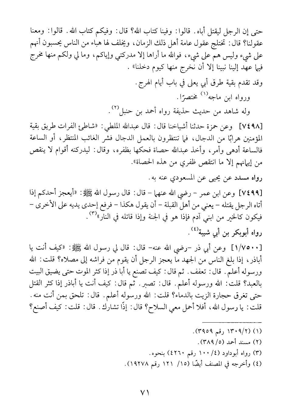 7500 / 1 - وَعَنِ أَبِي ذَرٍّ- رَضِيَ اللَّهُ عَنْهُ- قَالَ: قَالَ لِي رَسُولُ اللَّهِ - صَلَّى اللَّهُ عَلَيْهِ وَسَلَّمَ -: "كيف أنت يا أباذر، إذا بلغ الناس من الجهد مَا يَعْجَزُ الرَّجُلُ أَنْ يَقُومَ مِنْ فِرَاشِهِ إِلَى مُصَلَّاهُ؟ قُلْتُ: اللَّهُ وَرَسُولُهُ أَعْلَمُ. قَالَ: تعفف. ثم قال: كيف تصنع يَا أَبَا ذَرٍّ إِذَا كَثُرَ الْمَوْتُ حَتَّى يَضِيقَ الْبَيْتُ بِالْعَبْدِ؟ قُلْتُ: اللَّهُ وَرَسُولُهُ أَعْلَمُ. قَالَ: تَصْبِرُ. ثُمَّ قَالَ: كَيْفَ أَنْتَ يَا أباذر إِذَا كَثُرَ الْقَتْلُ حَتَّى تَغْرِقَ حِجَارَةُ الزَّيْتِ بِالدِّمَاءِ؟ قُلْتُ: اللَّهُ وَرَسُولُهُ أَعْلَمُ. قَالَ: تَلْحَقُ بِمَنْ أَنْتَ مِنْهُ. قُلْتُ: يَا رَسُولَ اللَّهِ، أَفَلَا أَحْمِلُ مَعِيَ السِّلَاحَ؟ قَالَ: إِذًا تُشَارِكُ. قَالَ: قُلْتُ: كَيْفَ أَصْنَعُ؟