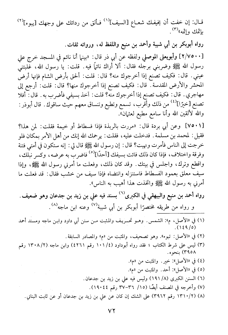 7500 / 2 - وَأَبُو يَعْلَى الْمَوْصِلِيُّ وَلَفْظُهُ عَنْ أَبِي ذَرٍّ قَالَ: "بَيْنَمَا أَنَا نَائِمٌ فِي الْمَسْجِدِ خَرَجَ عَلَى رَسُولِ اللَّهِ - صَلَّى اللَّهُ عَلَيْهِ وَسَلَّمَ -وَضَرَبَنِي بِرِجْلِهِ فَقَالَ: أَلَا أَرَاكَ نَائِمًا فِيهِ. قُلْتُ: يَا رَسُولَ اللَّهِ، غَلَبَتْنِي عَيْنِي. قَالَ: فَكَيْفَ تَصْنَعُ إِذَا أَخْرَجُوكَ مِنْهُ؟ قَالَ: قُلْتُ: أَلْحَقُ بِأَرْضِ الشَّامِ فَإِنَّهَا أَرْضُ الْمَحْشَرِ وَالْأَرْضُ الْمُقَدَّسَةُ. قَالَ: فَكَيْفَ تَصْنَعُ إِذَا أَخْرَجُوكَ مِنْهَا؟ قَالَ: قُلْتُ: أَرْجِعُ إِلَى مَهَاجِرِي. قَالَ: فَكَيْفَ تَصْنَعُ إِذَا أَخْرَجُوكَ مِنْهُ؟ قُلْتُ: آخُذُ بِسَيْفِي فَأَضْرِبُ بِهِ. قَالَ: أَفَلَا تَصْنَعُ خَيْرًا مِنْ ذلك وأقرب، تسمع وتطيع وتنساق معهم تحط ساقوك. قال أبو ذر: والله لَأَلْقَيَنَ اللَّهَ وَأَنَا سَامِعٌ مُطِيعٌ لِعُثْمَانَ".