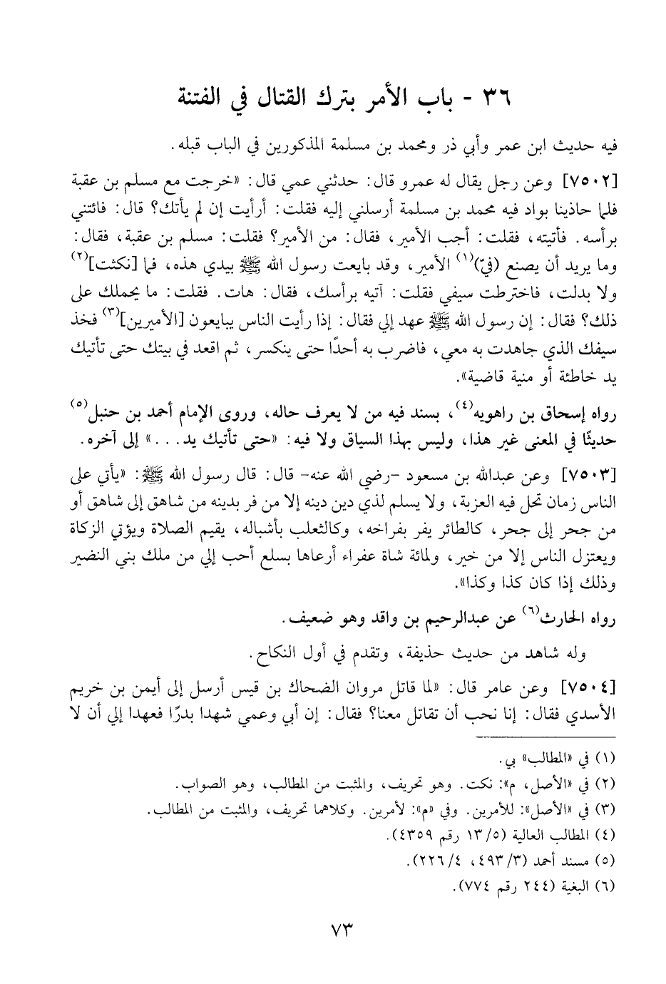 7502 - وَعَنْ رَجُلٍ يُقَالُ لَهُ عَمْرٌو قَالَ: حَدَّثَنِي عَمِّي قَالَ: "خَرَجْتُ مَعَ مُسْلِمِ بْنِ عُقْبَةَ فَلَمَّا حَاذَيْنَا بِوَادٍ فِيهِ مُحَمَّدُ بْنُ مَسْلَمَةَ أَرْسَلَنِي إِلَيْهِ فَقُلْتُ: أَرَأَيْتَ إن لم يأتك؟ قال: فائتني بِرَأْسِهِ. فَأَتَيْتُهُ، فَقُلْتُ: أَجِبِ الْأَمِيرَ، فَقَالَ: مَنِ الأمير؟ فقلت: مسلم بن عقبة، فقال: وَمَا يُرِيدُ أَنْ يَصْنَعَ فِيَّ الْأَمِيرُ، وَقَدْ بَايَعْتُ رَسُولُ اللَّهِ - صَلَّى اللَّهُ عَلَيْهِ وَسَلَّمَ - بِيَدِي هَذِهِ، فَمَا نَكَثْتُ وَلَا بَدَّلْتُ، فَاخْتَرَطْتُ سَيْفِي فَقُلْتُ: آتِيهِ بِرَأْسِكَ، فَقَالَ: هَاتِ. فَقُلْتُ: ما يَحْمِلُكَ عَلَى ذَلِكَ؟ فَقَالَ: إِنَّ رَسُولَ اللَّهِ - صَلَّى اللَّهُ عَلَيْهِ وَسَلَّمَ -عَهِدَ إِلَيَّ فَقَالَ: إذا رأيت الناس يبايعون لأميرين، فَخُذْ سَيْفَكَ الَّذِي جَاهَدْتَ بِهِ مَعِي، فَاضْرِبْ بِهِ أُحُدًا حَتَّى يَنْكَسِرَ، ثُمَّ اقْعُدْ فِي بَيْتِكَ حَتَّى تَأْتِيَكَ يَدٌ خَاطِئَةٌ أَوْ مَنِيَّةٌ قَاضِيَةٌ".