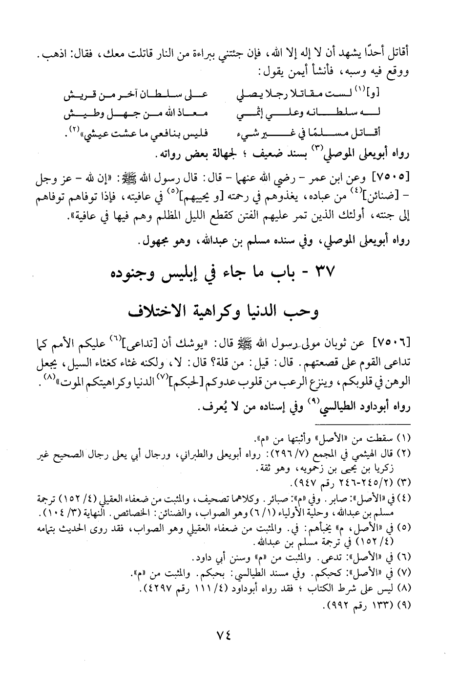 7506 - عَنْ ثَوْبَانَ مَوْلَى رَسُولِ اللَّهِ - صَلَّى اللَّهُ عَلَيْهِ وَسَلَّمَ -قال: "يُوشِكُ أَنْ تَدَاعَى عَلَيْكُمُ الْأُمَمُ كَمَا تَدَاعَى الْقَوْمُ عَلَى قَصْعَتِهِمْ. قَالَ: قِيلَ: مِنْ قِلَّةٍ؟ قال: لا، ولكنه غثاء كغثاء السَّيْلِ، يُجْعَلُ الْوَهَنُ فِي قُلُوبِكُمْ، وَيُنْزَعُ الرُّعْبُ من قلوب عدوكم لحبكم الدنيا وكراهيتكم الْمَوْتِ" رَوَاهُ أَبُو دَاوُدَ الطَّيَالِسِيُّ وَفِي إِسْنَادِهِ من لا يُعرف.