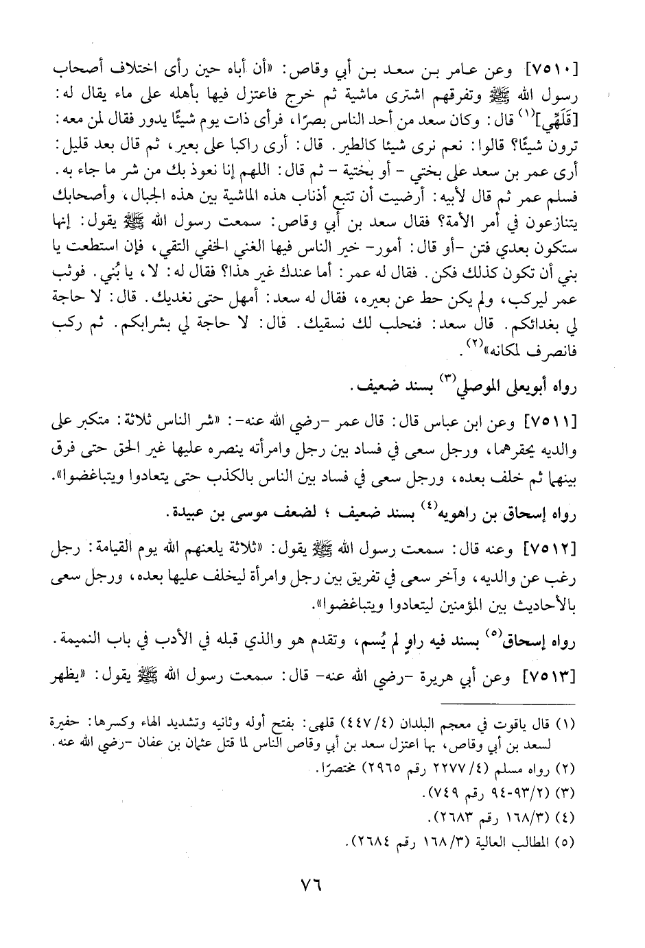 7510 - وَعَنْ عَامِرِ بْنِ سَعْدِ بْنِ أَبِي وَقَّاصٍ: "أَنَّ أَبَاهُ حِينَ رَأَى اخْتِلَافَ أَصْحَابِ رَسُولِ اللَّهِ - صَلَّى اللَّهُ عَلَيْهِ وَسَلَّمَ - وَتَفَرُّقَهُمْ اشْتَرَى مَاشِيَةً ثُمَّ خَرَجَ فَاعْتَزَلَ فِيهَا بِأَهْلِهِ عَلَى ماء يقال له: قَلَهِّي قَالَ: وَكَانَ سَعْدٌ مِنْ أَحَدِّ النَّاسِ بَصَرًا، فَرَأَى ذَاتَ يَوْمٍ شَيْئًا يَدُورُ فَقَالَ لِمَنْ مَعَهُ: تَرَوْنَ شَيْئًا؟ قَالُوا: نَعَمْ نَرَى شَيْئًا كَالطَّيْرِ. قَالَ: أَرَى رَاكِبًا عَلَى بَعِيرٍ، ثُمَّ قَالَ بَعْدَ قَلِيلٍ: أَرَى عُمَرَ بْنَ سَعْدٍ عَلَى بُخْتِيٍّ- أَوْ بُخْتِيَّةٍ- ثُمَّ قَالَ: اللَّهُمَّ إِنَّا نَعُوذُ بِكَ مِنْ شَرِّ مَا جَاءَ بِهِ. فَسَلَّمَ عُمَرُ ثُمَّ قَالَ لِأَبِيهِ: أَرَضِيتَ أَنْ تَتْبَعَ أَذْنَابَ هَذِهِ الْمَاشِيَةِ بَيْنَ هَذِهِ الجبال، وأصحابك يتنازعون في أمر الْأُمَّةِ؟ فَقَالَ سَعْدِ بْنِ أَبِي وَقَّاصٍ: سَمِعْتُ رَسُولَ اللَّهِ - صلى الله عليه وسلم -يقول: إنها ستكون بعدي فتن- أو قال: أُمُورٌ- خَيْرُ النَّاسِ فِيهَا الْغَنِيُّ الْخَفِيُّ التَّقِيُّ، فَإِنِ اسْتَطَعْتَ يَا بُنَيَّ أَنْ تَكُونَ كَذَلِكَ فَكُنْ. فَقَالَ لَهُ عُمَرُ: أَمَا عِنْدَكَ غَيْرَ هَذَا؟ فَقَالَ لَهُ: لَا، يَا بُني. فَوَثَبَ عُمَرُ لِيَرْكَبَ، وَلَمْ يَكُنْ حَطَّ عَنْ بَعِيرِهِ، فقالت لَهُ سَعْدٌ: أَمْهِلْ حَتَّى نُغَدِّيَكَ. قَالَ: لَا حَاجَةَ لِي بِغَدَائِكُمْ. قَالَ سَعْدٌ: فَنَحْلِبُ لَكَ نَسْقِيكَ. قَالَ: لَا حَاجَةَ لِي بِشَرَابِكُمْ. ثُمَّ ركب فانصرف لمكانه".
