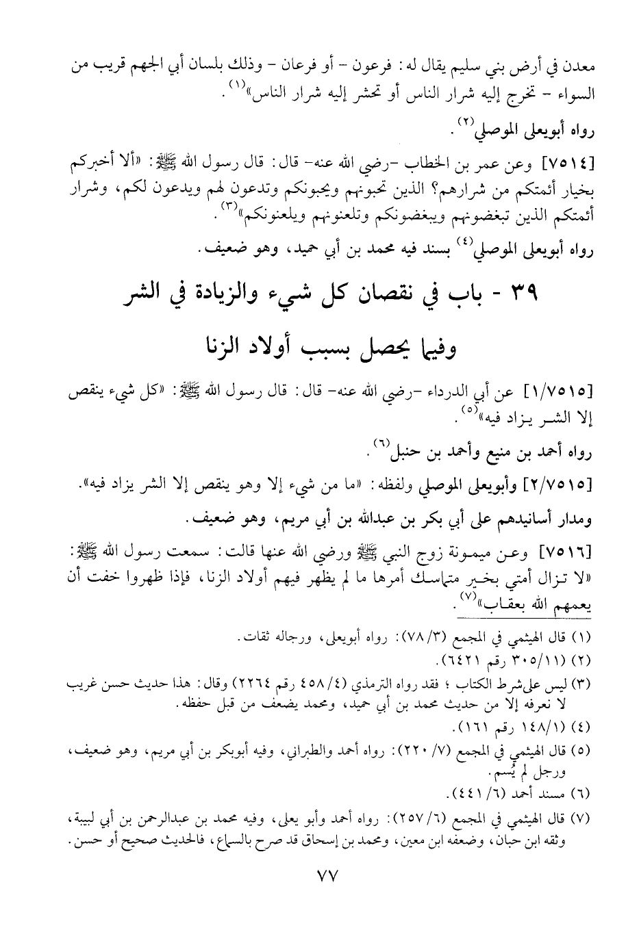 7515 / 2 - وَأَبُو يَعْلَى الْمَوْصِلِيُّ وَلَفْظُهُ: "مَا مِنْ شَيْءٍ إِلَّا وَهُوَ يَنْقُصُ إِلَّا الشَّرَّ يُزَادُ فِيهِ". وَمَدَارُ أَسَانِيدِهِمْ عَلَى أَبِي بَكْرِ بْنِ عَبْدِ اللَّهِ بْنِ أَبِي مَرْيَمَ، وَهُوَ ضَعِيفٌ.