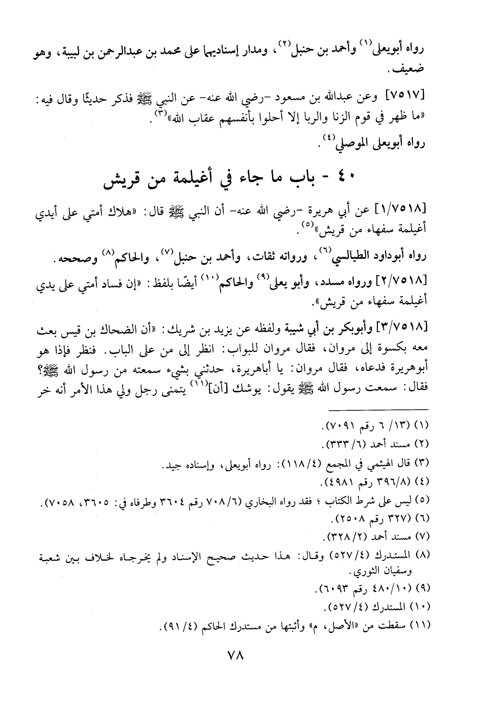 7518 / 2 - وَرَوَاهُ مُسَدَّدٌ، وأبو يعلى والحاكم أيضًا بلفظ: "إن فساد أُمَّتِي عَلَى يَدَيْ أُغَيْلِمَةٍ سُفَهَاءَ مِنْ قُرَيْشٍ".