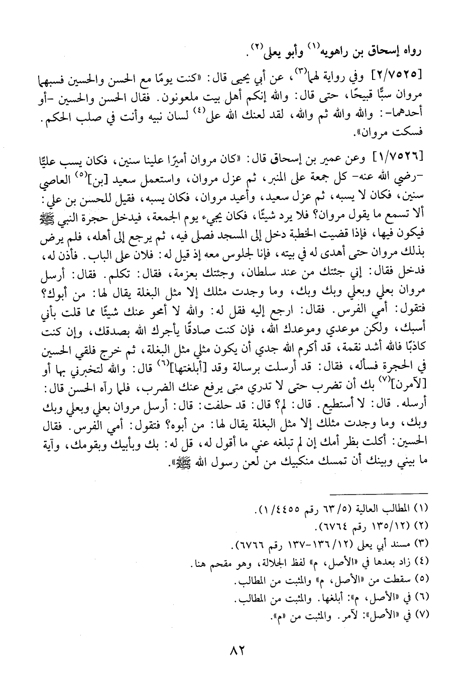 7526 / 1 - وَعَنْ عمير بن إسحاق قال: "كَانَ مَرْوَانُ أَمِيرًا عَلَيْنَا سِنِينَ، فَكَانَ يَسُبُّ عَلِيًّا - رَضِيَ اللَّهُ عَنْهُ- كُلَّ جُمُعَةٍ عَلَى الْمِنْبَرِ، ثُمَّ عُزِلَ مَرْوَانُ، وَاسْتُعْمِلَ سَعِيدُ بْنُ العاصي سِنِينَ، فَكَانَ لَا يَسُبُّهُ، ثُمَّ عُزِلَ سَعِيدٌ، وَأُعِيدَ مَرْوَانُ، فَكَانَ يَسُبُّهُ، فَقِيلَ لِلْحَسَنِ بْنِ عَلِيٍّ: أَلَا تَسْمَعُ مَا يَقُولُ مَرْوَانُ؟ فَلَا يرد شيئًا، فكان يجيء يَوْمَ الْجُمُعَةِ، فَيَدْخُلَ حُجْرَةَ النَّبِيِّ - صَلَّى اللَّهُ عَلَيْهِ وَسَلَّمَ - فَيَكُونُ فِيهَا، فَإِذَا قُضِيَتِ الْخُطْبَةُ دَخَلَ إِلَى الْمَسْجِدِ فَصَلَّى فِيهِ، ثُمَّ يَرْجِعُ إِلَى أَهْلِهِ، فَلَمْ يَرْضَ بِذَلِكَ مَرْوَانُ حَتَّى أَهْدَى لَهُ فِي بَيْتِهِ، فَإِنَّا لَجُلُوسٌ مَعَهُ إِذْ قِيلَ لَهُ: فُلَانٌ عَلَى الْبَابِ. فَأَذِنَ له، فدخل فقال: إِنِّي جِئْتُكَ مِنْ عِنْدِ سُلْطَانٍ، وَجِئْتُكَ بِعَزْمَةٍ، فَقَالَ: تَكَلَّمْ. فَقَالَ: أَرْسَلَ مَرْوَانُ بِعَلِيٍّ وَبِعَلِيٍّ وبك وَبِكَ، وَمَا وَجَدْتُ مَثَلُكَ إِلَّا مَثَلَ الْبَغْلَةِ يقال لها: من أبوك؟ فتقول: أمي الفرس. فَقَالَ: ارْجِعْ إِلَيْهِ فَقُلْ لَهُ: وَاللَّهِ لَا أمحو عنك شيئًا مما قلت بأني أسبك، وَلَكِنْ مَوْعِدِي وَمَوْعِدُكَ اللَّهَ، فَإِنْ كُنْتَ صَادِقًا يَأْجُرُكَ اللَّهُ بِصِدْقِكَ، وَإِنْ كُنْتَ كَاذِبًا فَاللَّهُ أَشَدُّ نِقْمَةً، قَدْ أَكْرَمَ اللَّهُ جَدِّي أَنْ يَكُونَ مَثَلِي مَثَلُ الْبَغْلَةِ، ثُمَّ خَرَجَ فَلَقِيَ الْحُسَيْنَ فِي الْحُجْرَةِ فَسَأَلَهُ، فَقَالَ: قَدْ أُرْسِلْتُ بِرِسَالَةٍ وَقَدْ أَبْلَغْتُهَا، قَالَ: وَاللَّهِ لَتُخْبِرُنِّي بِهَا أو لآمرن بِكَ أَنْ تُضْرَبَ حَتَّى لَا تَدْرِي مَتَى يُرْفَعُ عَنْكَ الضَّرْبُ، فَلَمَّا رَآهُ الْحَسَنُ قَالَ: أَرْسِلْهُ. قَالَ: لَا أَسْتَطِيعُ. قَالَ: لِمَ؟ قَالَ: قَدْ حَلَفْتُ: قَالَ: أَرْسَلَ مَرْوَانُ بِعَلِيٍّ وَبِعَلِيٍّ وبك وَبِكَ، وَمَا وَجَدْتُ مَثَلُكَ إِلَّا مَثَلَ الْبَغْلَةِ يقال لها: من أبوه؟ فَتَقُولُ: أُمِّيَ الْفَرَسُ. فَقَالَ الْحُسَيْنُ: أَكَلْتَ بَظَرَ أُمِّكَ إِنْ لَمْ تُبَلِّغْهُ عَنِّي مَا أَقُولُ لَهُ، قُلْ لَهُ: بِكَ وَبِأَبِيكَ وَبِقَوْمِكَ، وَآيَةُ ما بيني وبينك أن تمسك منكبيك مَنْ لَعَنَ رَسُولِ اللَّهِ - صَلَّى اللَّهُ عَلَيْهِ وَسَلَّمَ -".