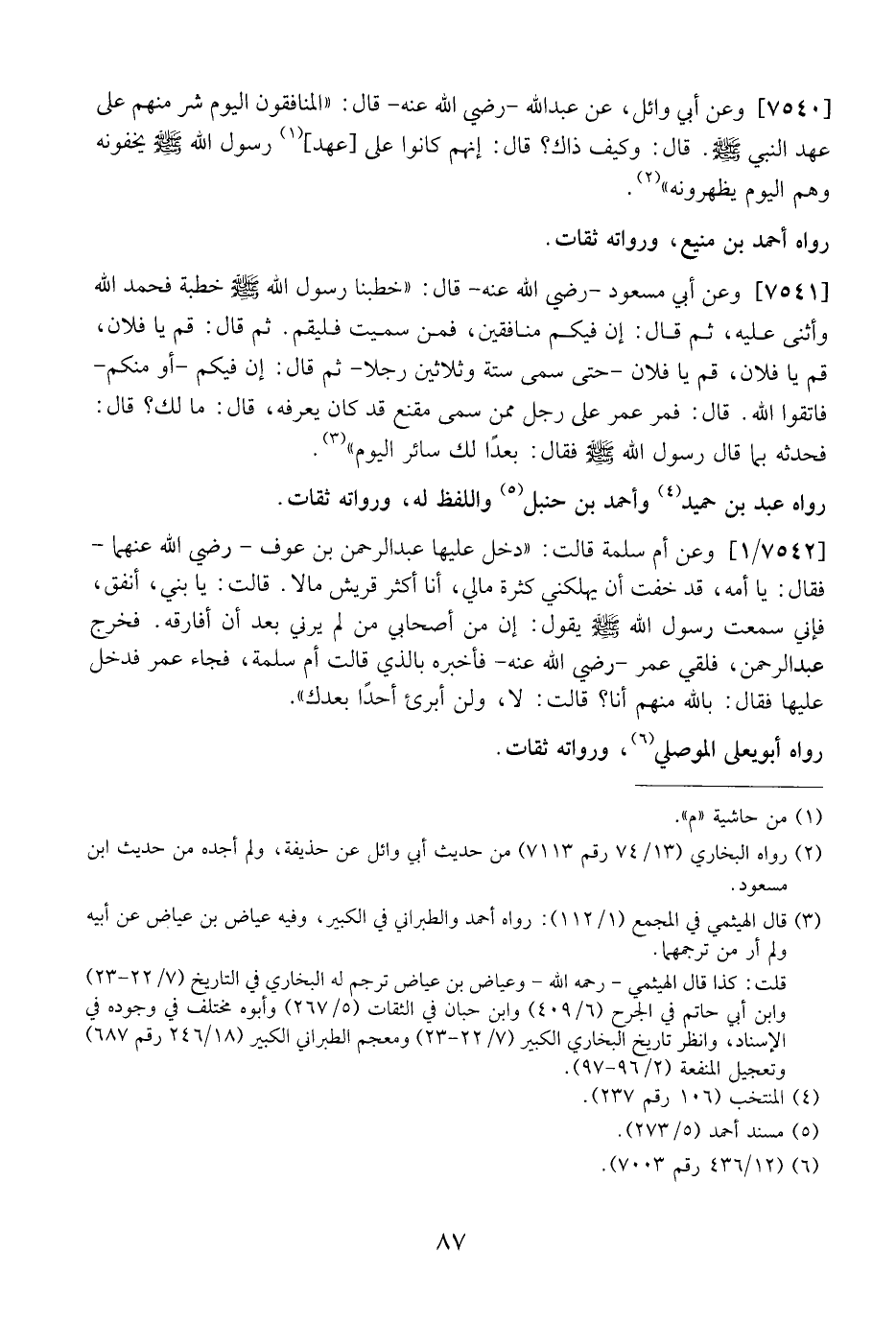 7540 - وَعَنْ أَبِي وَائِلٍ، عَنْ عَبْدِ اللَّهِ- رَضِيَ اللَّهُ عَنْهُ- قَالَ: "الْمُنَافِقُونَ الْيَوْمَ شَرٌّ مِنْهُمْ عَلَى عَهْدِ النَّبِيِّ - صَلَّى اللَّهُ عَلَيْهِ وَسَلَّمَ - قَالَ: وَكَيْفَ ذَاكَ؟ قال: إنهم كانوا عَلَى عَهْدِ رَسُولِ اللَّهِ - صَلَّى اللَّهُ عَلَيْهِ وَسَلَّمَ - يُخْفُونَهُ وَهُمُ الْيَوْمَ يُظْهِرُونَهُ".