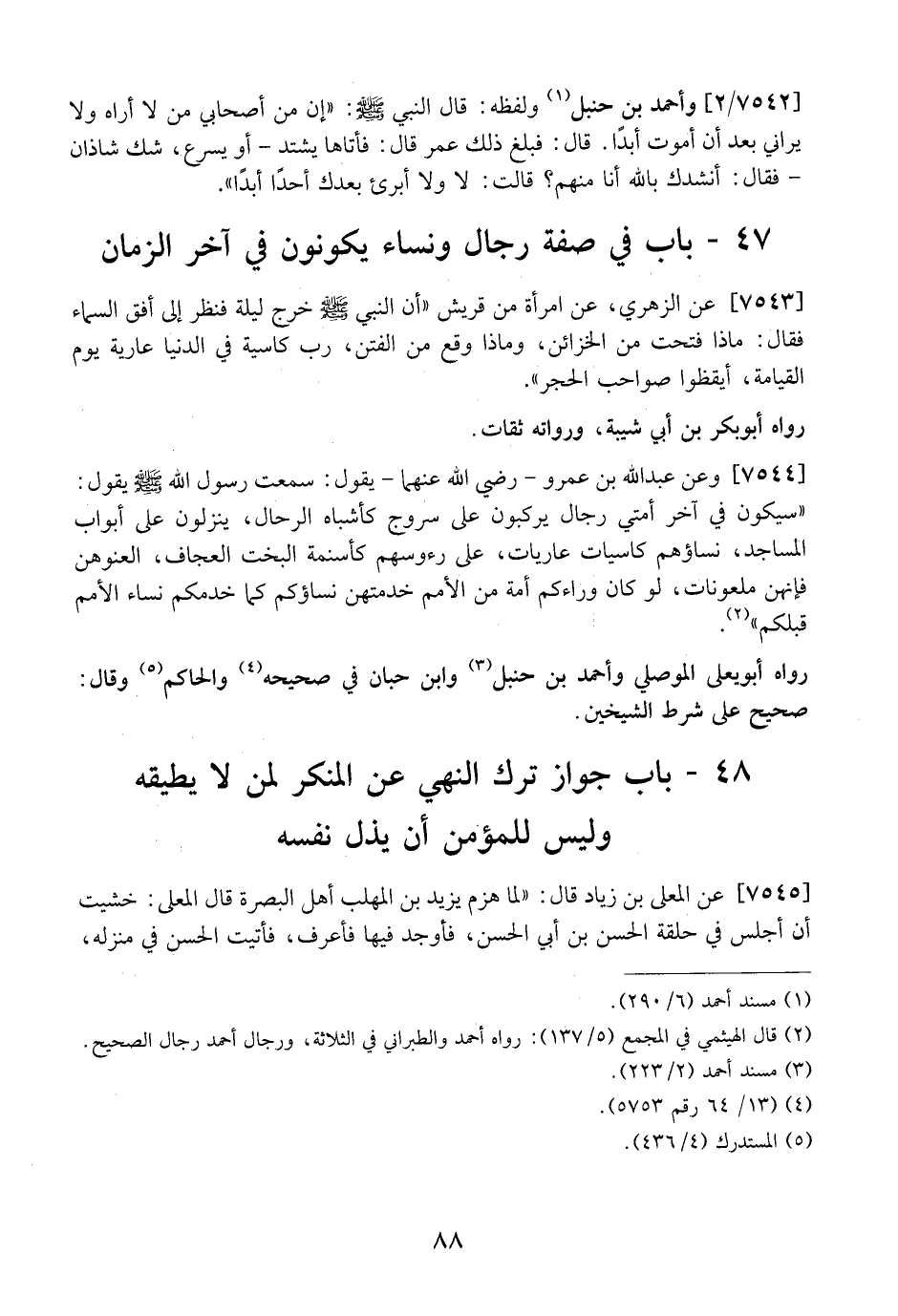 7544 - وَعَنْ عَبْدِ اللَّهِ بْنِ عَمْروٍ- رَضِيَ اللَّهُ عَنْهُمَا- يَقُولُ: سَمِعْتُ رَسُولَ اللَّهِ - صَلَّى اللَّهُ عَلَيْهِ وَسَلَّمَ -يَقُولُ: "سَيَكُونُ فِي آخِرِ أُمَّتِي رِجَالٌ يَرْكَبُونَ عَلَى سُرُوجٍ كأشباه الرحال، يَنْزِلُونَ عَلَى أَبْوَابِ الْمَسَاجِدِ، نِسَاؤُهُمْ كَاسِيَاتٌ عَارِيَاتٌ، عَلَى رُءُوسِهِمْ كَأَسْنِمَةِ الْبُخْتِ الْعِجَافِ، الْعَنُوهُنَّ فَإِنَّهُنَّ مَلْعُونَاتٍ، لَوْ كَانَ وَرَاءَكُمْ أُمَّةٌ مِنَ الْأُمَمِ خَدَمَتْهُنَّ نِسَاؤُكُمْ كَمَا خَدَمَكُمْ نِسَاءُ الْأُمَمِ قَبْلَكُمْ".