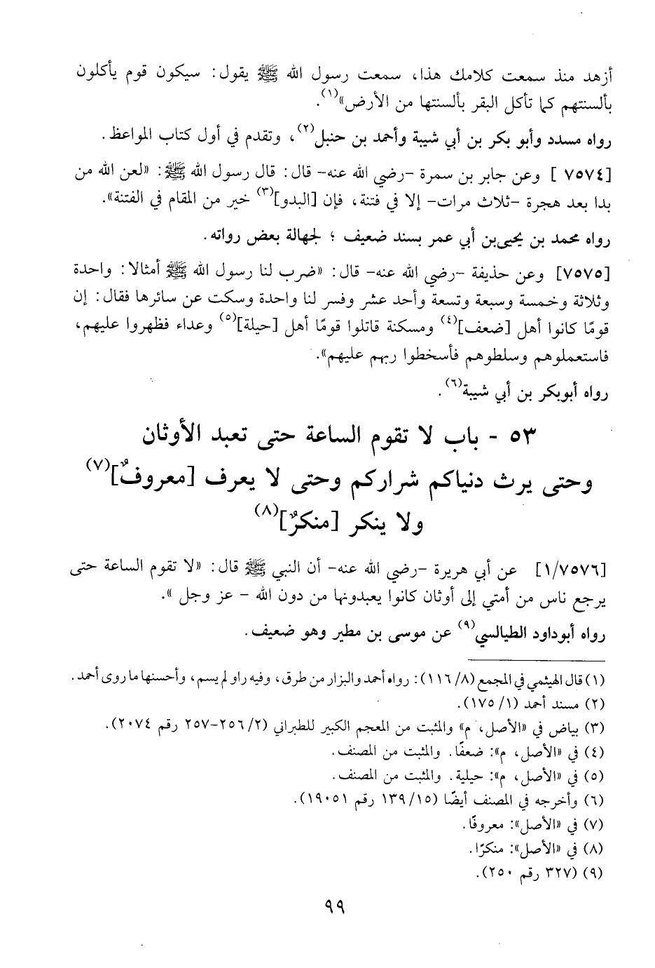 7576 / 1 - عَنْ أَبِي هُرَيْرَةَ- رَضِيَ اللَّهُ عَنْهُ- أَنّ النَّبِيَّ - صَلَّى اللَّهُ عليه وسلم -قال: "لا تقوم الساعة حتى يَرْجِعَ نَاسٌ مِنْ أُمَّتِي إِلَى أَوْثَانٍ كَانُوا يَعْبُدُونَهَا مِنْ دُونِ اللَّهِ- عَزَّ وَجَلَّ".