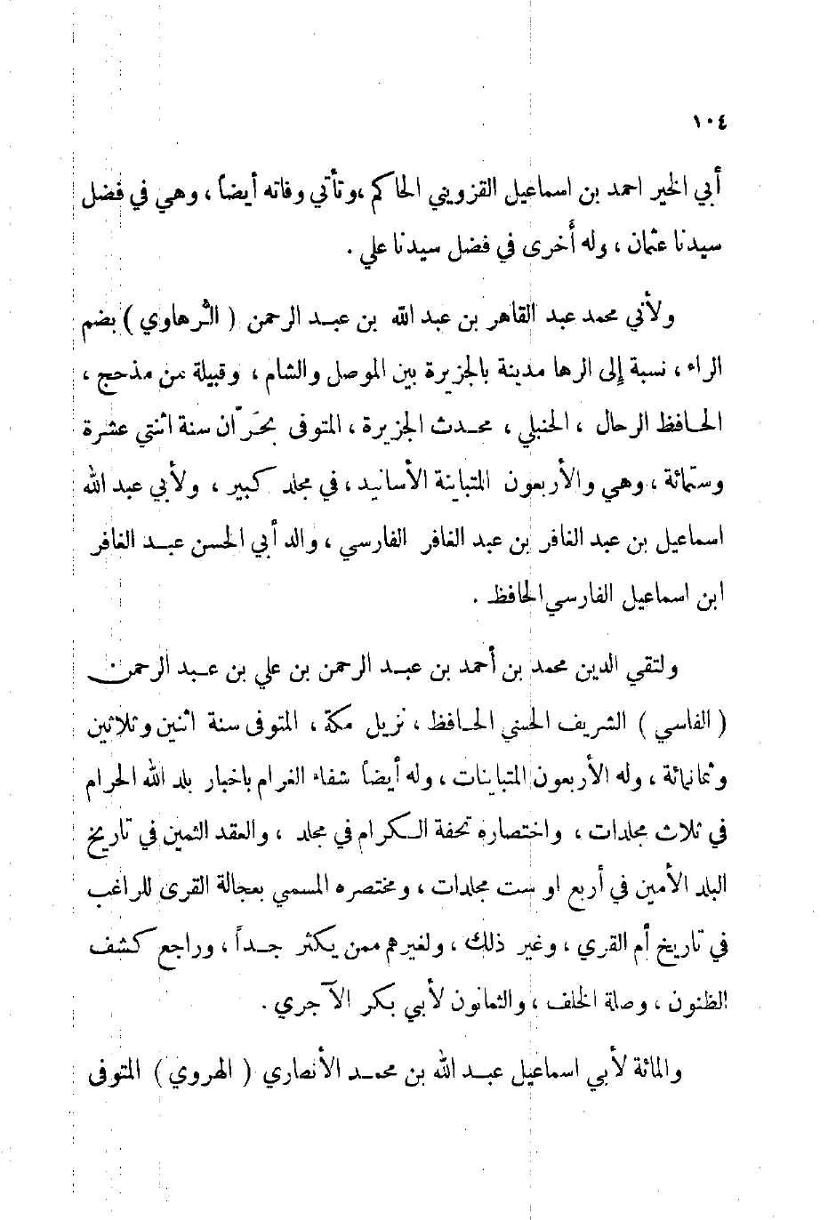 ولتقي الدين محمد بن أحمد بن عبد الرحمن بن علي بن عبد الرحمن الفاسي الشريف الحسن الحافظ نزيل مكة المتوفى: سنة اثنين وثلاثين وثمانمائة وله الأربعون المتباينات وله أيضا: شفاء الغرام بأخبار بلد الله الحرام في ثلاث مجلدات واختصاره تحفة الكرام في مجلد والعقد الثمين في تاريخ البلد الأمين في أربع أو ست مجلدات ومختصره المسمي: بعجالة القرى للراغب في تاريخ أم القري وغير ذلك ولغيرهم ممن يكثر جدا وراجع كشف الظنون وصلة الخلف والثمانون لأبي بكر الآجري.
