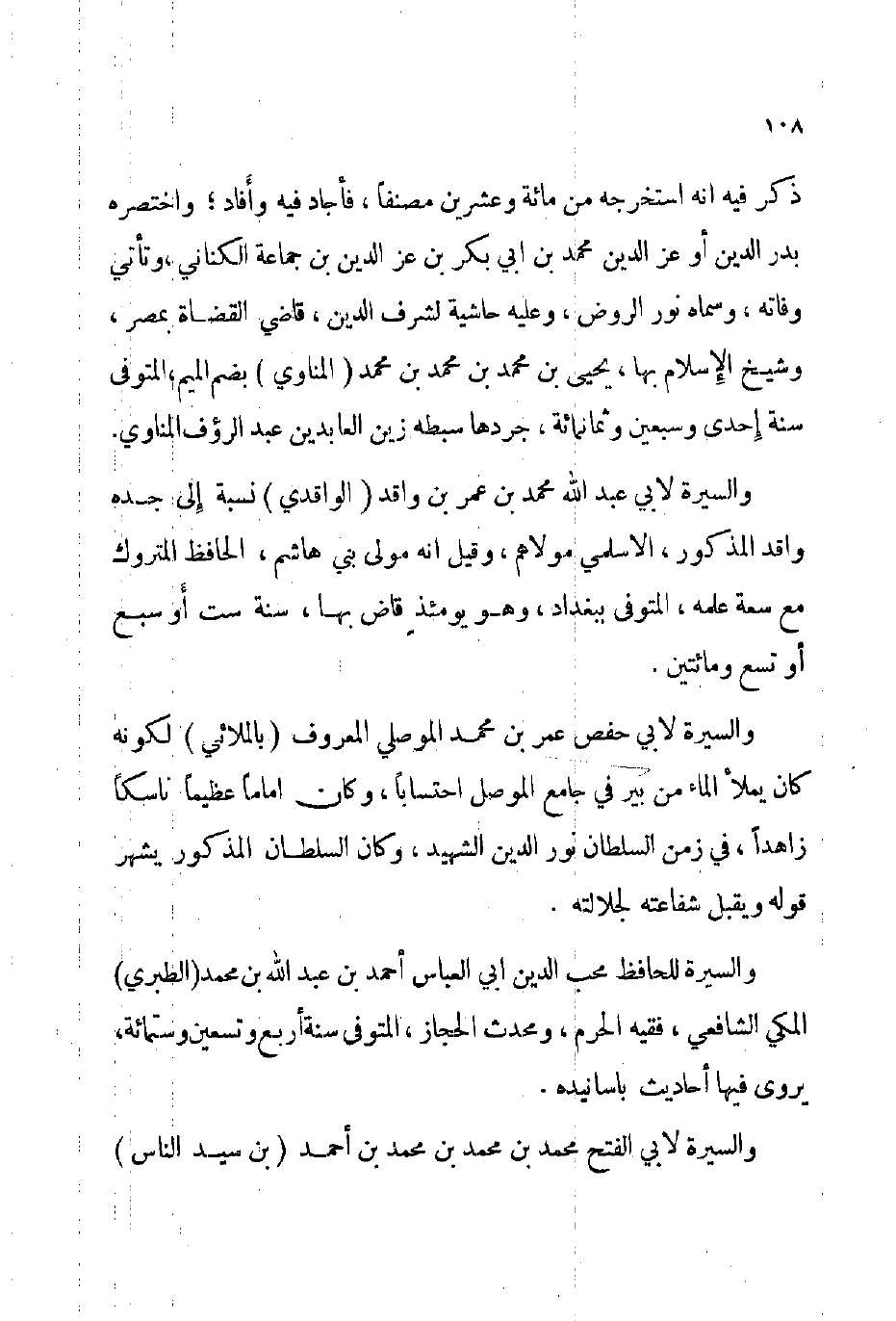 ذكر فيه أنه استخرجه من مائة وعشرين مصنفا فأجاد فيه وأفاد واختصره بدر الدين أو عز الدين محمد بن أبي بكر بن عز الدين بن جماعة الكناني وتأتي وفاته وسماه نور الروض وعليه حاشية لشرف الدين قاضي القضاة بمصر وشيخ الإسلام بها يحيى بن محمد بن محمد بن محمد المناوي بضم الميم المتوفى: سنة إحدى وسبعين وثمانمائة جردها سبطه زين العابدين عبد الرؤوف المناوي والسيرة لأبي عبد الله محمد بن عمر بن واقد الواقدي نسبة إلى جده واقد المذكور الأسلمي مولاهم وقيل: أنه مولى بني هاشم الحافظ المتروك مع سعة علمه المتوفى: ببغداد وهو يومئذ قاض بها سنة ست أو سبع أو تسع ومائتين.
