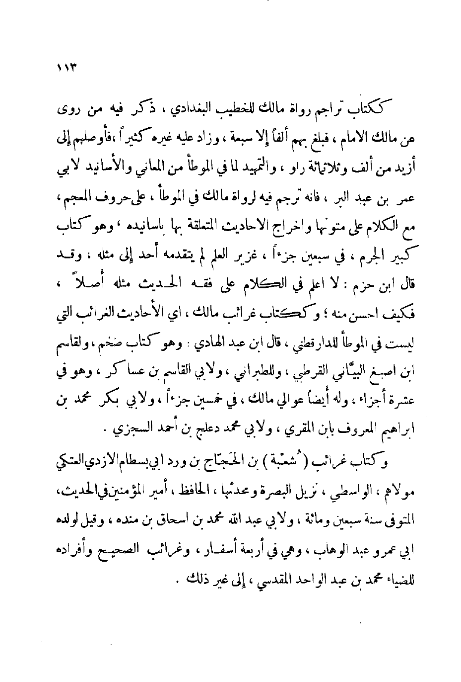 ككتاب تراجم رواة مالك للخطيب البغدادي ذكر فيه من روى عن مالك الإمام فبلغ بهم ألفا إلا سبعة وزاد عليه غيره كثيرا فأوصلهم إلى أزيد من ألف وثلاثمائة راو، والتمهيد لما في الموطأ من المعاني والأسانيد لأبي عمر بن عبد البر فإنه ترجم فيه لرواة مالك في الموطأ على حروف المعجم مع الكلام على متونها وإخراج الأحاديث المتعلقة بها بأسانيده وهو كتاب كبير الجرم في سبعين جزءا غزير العلم لم يتقدمه أحد إلى مثله وقد قال ابن حزم: لا أعلم في الكلام على فقه الحديث مثله أصلا فكيف أحسن منه وككتاب غرائب مالك أي: الأحاديث الغرائب التي ليست في الموطأ للدارقطني قال ابن عبد الهادي: وهو كتاب ضخم ولقاسم بن أصبغ البياني القرطبي وللطبراني ولأبي القاسم بن عساكر وهو في عشرة أجزاء وله أيضا عوالي مالك في خمسين جزءا ولأبي بكر محمد بن إبراهيم المعروف بابن المقري ولأبي محمد دعلج بن أحمد السجزي.