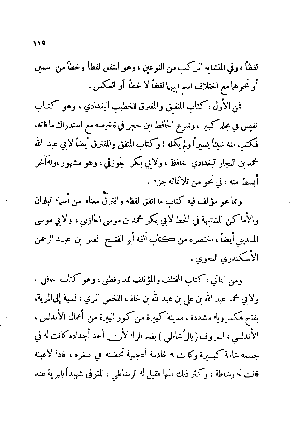 ومن الثاني: كتاب المختلف والمؤتلف للدار قطني وهو كتاب حافل ولأبي محمد عبد الله بن علي بن عبد الله بن خلف اللخمي المري نسبة إلى المرية بفتح فكسر وياء مشددة مدينة كبيرة من كور البيرة من أعمال الأندلس الأندلسي المعروف: بالرشاطي بضم الراء لأن أحد أجداده كانت له في جسمه شامة كبيرة وكانت له خادمة أعجمية تحضنه في صغره فإذا لاعبته قالت له رشاطة وكثر ذلك منها فقيل له: الرشاطي المتوفى شهيدا: بالمرية عند
