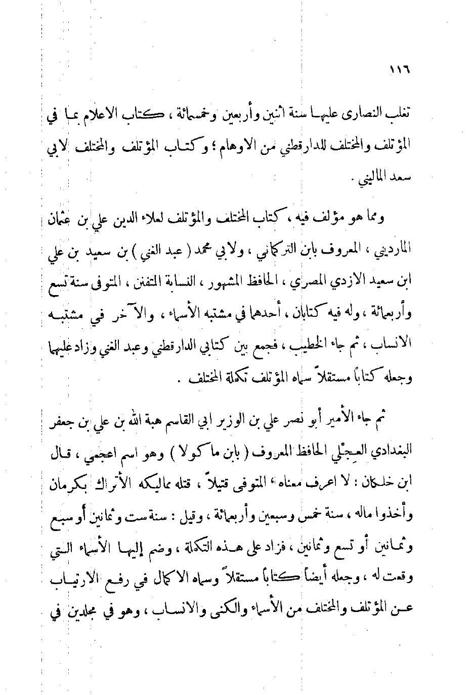 ثم جاء الأمير أبو نصر علي بن الوزير أبي القاسم هبة الله بن علي بن جعفر البغدادي العجلي الحافظ المعروف بابن ماكولا وهو اسم أعجمي قال ابن خلكان: لا أعرف معناه المتوفى: قتيلا قتله مماليكه الأتراك بكرمان وأخذوا ماله سنة خمس وسبعين وأربعمائة وقيل: سنة ست وثمانين أو سبع وثمانين أو تسع وثمانين فزاد على هذه التكملة وضم إليها الأسماء التي وقعت له وجعله أيضا كتابا مستقلا وسماه: الإكمال في رفع الارتياب عن المؤتلف والمختلف من الأسماء والكنى والأنساب وهو في مجلدين في