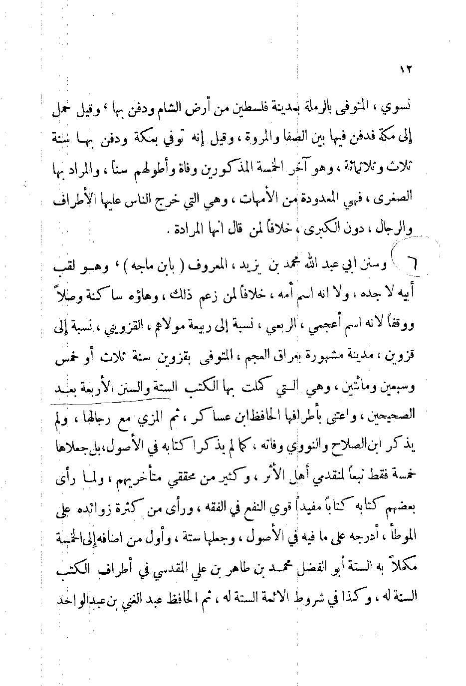 وسنن أبي عبد الله محمد بن يزيد المعروف بابن ماجة وهو لقب أبيه لا جده ولا أنه اسم أمه خلافا لمن زعم ذلك وهاؤه ساكنة وصلا ووقفا لأنه اسم أعجمي الربعي نسبة إلى ربيعة مولاهم القزويني نسبة إلى قزوين مدينة مشهورة بعراق العجم المتوفى بقزوين سنة ثلاث أو خمس وسبعين ومائتين وهي التي كملت بها الكتب الستة والسنن الأربعة بعد الصحيحين واعتنى بأطرافها الحافظ ابن عساكر ثم المزي مع رجالها ولم يذكر ابن الصلاح والنووي وفاته كما لم يذكرا كتابه في الأصول بل جعلاها خمسة فقط تبعا لمتقدمي أهل الأثر وكثير من محققي متأخريهم ولما رأى بعضهم كتابه كتابا مفيدا قوي النفع في الفقه ورأى من كثرة زوائده على الموطأ أدرجه على ما فيه في الأصول وجعلها ستة وأول من أضافه إلى الخمسة مكملا به الستة أبو الفضل محمد بن طاهر بن علي المقدسي في أطراف الكتب الستة له وكذا في شروط الأئمة الستة له ثم الحافظ عبد الغني بن عبد الواحد