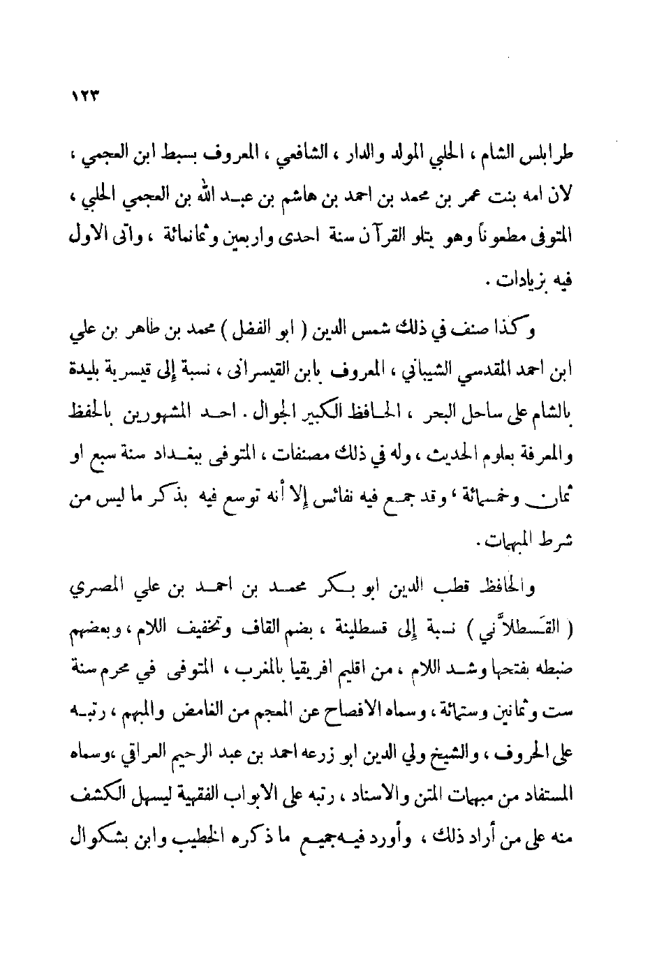 وكذا صنف في ذلك شمس الدين أبو الفضل محمد بن طاهر بن علي بن أحمد المقدسي الشيباني المعروف: بابن القيسراني نسبة إلى قيسرية بليدة بالشام على ساحل البحر الحافظ الكبير الجوال. أحد المشهورين بالحفظ والمعرفة بعلوم الحديث وله في ذلك مصنفات المتوفى: ببغداد سنة سبع أو ثمان وخمسمائة وقد جمع فيه نفائس إلا أنه توسع فيه بذكر ما ليس من شرط المبهمات.