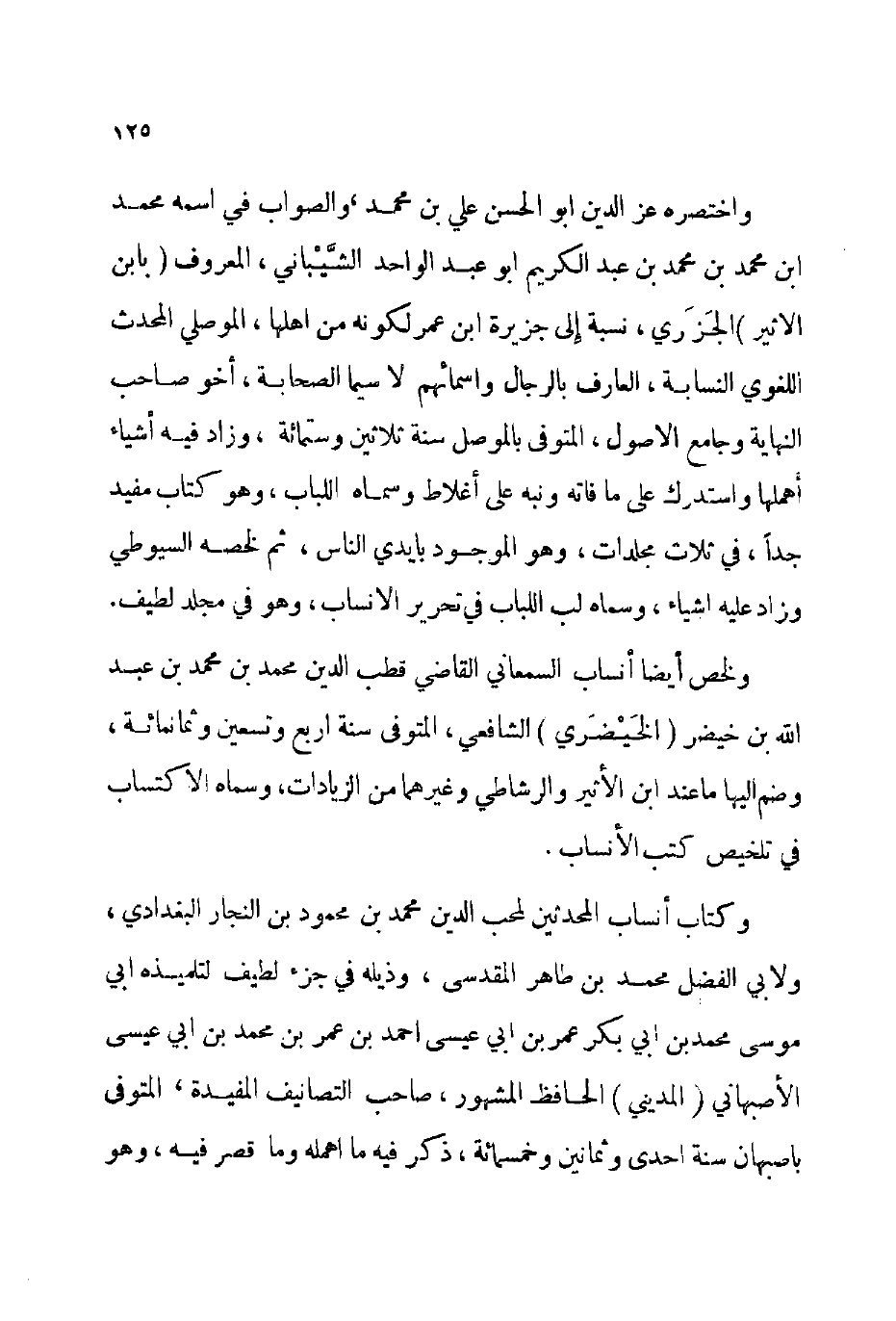 واختصره عز الدين أبو الحسن علي بن محمد والصواب في اسمه: محمد بن محمد بن محمد بن عبد الكريم أبو عبد الله الشيباني المعروف: بابن الأثير الجزري نسبة إلى جزيرة ابن عمر لكونه من أهلها الموصلي المحدث الغوي النسابة العارف بالرجال وأسمائهم لاسيما الصحابة أخو صاحب النهاية وجامع الأصول المتوفى: بالموصل سنة ثلاثين وستمائة وزاد فيه أشياء أهملها واستدرك على مافاته ونبه على أغلاط وسماه: اللباب وهو كتاب مفيد جدا في ثلاثة مجلدات وهو الموجود بأيدي الناس ثم لخصه السيوطي وزاد عليه أشياء وسماه: لب اللباب في تحرير الأنساب وهو في مجلد لطيف ولخص أيضا أنساب السمعاني القاضي قطب الدين محمد بن محمد بن عبد الله بن خيضر الخيضري الشافعي المتوفى: سنة أربع وتسعين وثمانمائة وضم إليها ماعند ابن الأثير والرشاطي وغيرهما من الزيادات وسماه: الاكتساب في تلخيص كتب الأنساب.
