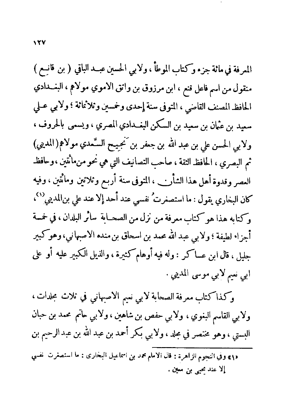 المعرفة في مائة جزء وكتاب الموطأ ولأبي الحسين عبد الباقي بن قانع منقول من اسم فاعل قنع ابن مرزوق بن واثق الأموي مولاهم البغدادي الحافظ المصنف القاضي المتوفى: سنة إحدى وخمسين وثلاثمائة ولأبي علي سعيد بن عثمان بن سعيد بن السكن البغدادي المصري ويسمى: بالحروف ولأبي الحسن علي بن عبد الله بن جعفر بن نجيح السعدي مولاهم المديني ثم البصري الحافظ الثقة صاحب التصانيف التي هي نحو من مائتين وحافظ العصر وقدوة أهل هذا الشأن المتوفى: سنة أربع وثلاثين ومائتين وفيه كان البخاري يقول: ما استصغرت نفسي عند أحد إلا عند علي بن المديني1 وكتابه هذا هو: كتاب معرفة من نزل من الصحابة سائر البلدان في خمسة أجزاء لطيفة ولأبي عبد الله محمد بن إسحاق بن منده الأصبهاني وهو كبير جليل قال ابن عساكر: وله فيه أوهام كثيرة والذيل الكبير عليه أو على أبي نعيم لأبي موسى المديني.