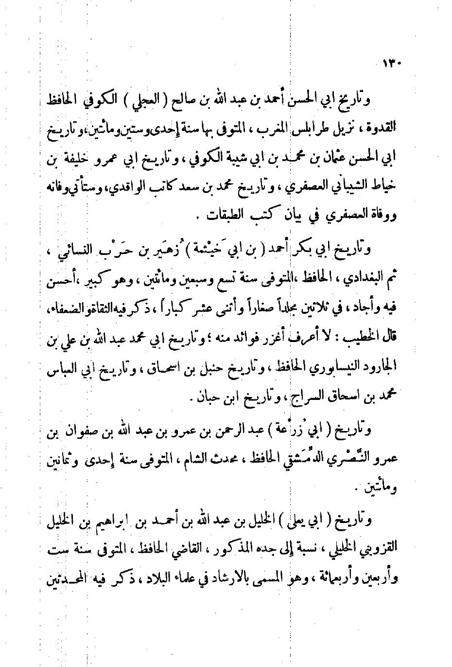 وتاريخ أبي الحسن أحمد بن عبد الله بن صالح العجلي الكوفي الحافظ القدوة نزيل طرابلس المغرب المتوفى بها: سنة إحدى وستين ومائتين وتاريخ أبي الحسن عثمان بن محمد بن أبي شيبة الكوفي وتاريخ أبي عمرو خليفة بن خياط الشيباني العصفري وتاريخ محمد بن سعد كاتب الواقدي وستأتي وفاته ووفاة العصفري في بيان كتب الطبقات.