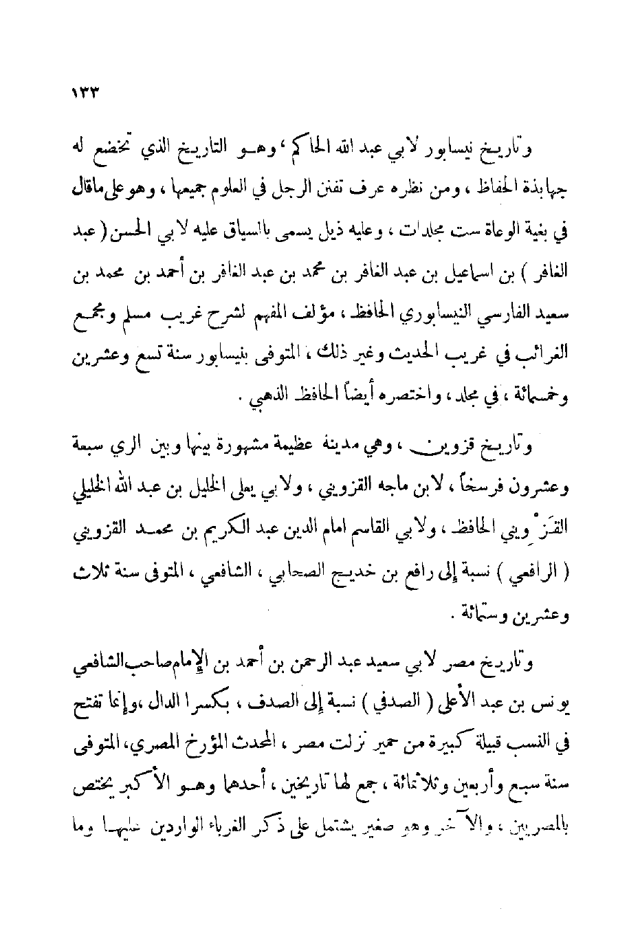 وتاريخ قزوين وهي مدينة عظيمة مشهورة بينها وبين الري سبعة وعشرون فرسخا لابن ماجة القزويني ولأبي يعلى الخليل بن عبد الله الخليلي القزويني الحافظ ولأبي القاسم إمام الدين عبد الكريم بن محمد القزويني الرافعي نسبة إلى رافع بن خديج الصحابي الشافعي المتوفى: سنة ثلاث وعشرين وستمائة.
