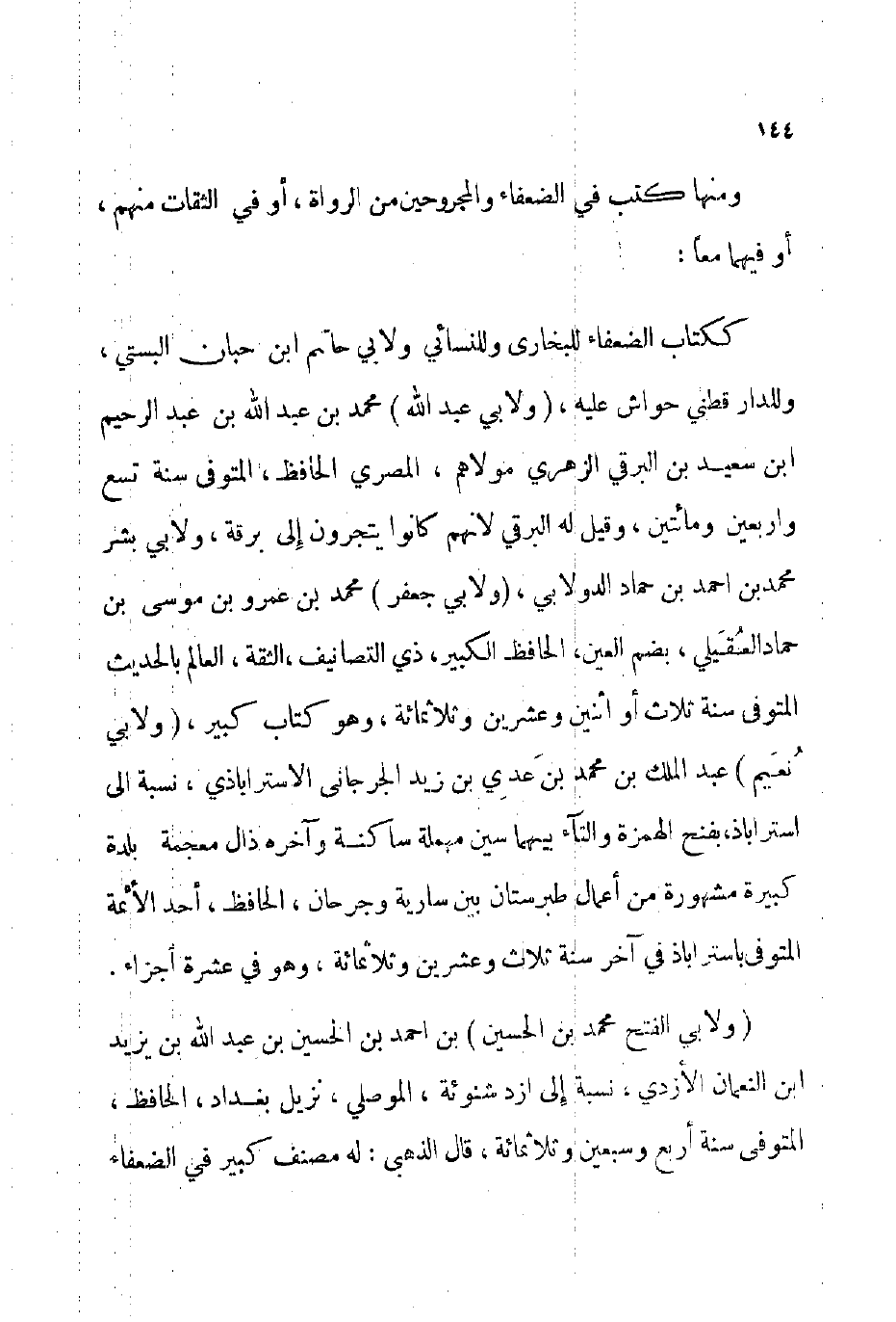 ككتاب الضعفاء للبخاري وللنسائي ولأبي حاتم بن حبان البستي وللدارقطني حواش عليه ولأبي عبد الله محمد بن عبد الله بن عبد الرحيم بن سعيد بن البرقي الزهري مولاهم المصري الحافظ المتوفى: سنة تسع وأربعين ومائتين وقيل له: البرقي لأنهم كانوا يتجرون إلى برقة. ولأبي بشر محمد بن أحمد بن حماد الدولابي ولأبي جعفر محمد بن عمرو بن موسى بن حماد العقيلي بضم العين الحافظ الكبير ذي التصانيف الثقة العالم بالحديث المتوفى: سنة ثلاث أو اثنين وعشرين وثلاثمائة وهو كتاب كبير، ولأبي نعيم عبد الملك بن محمد بن عدي بن زيد الجرجاني الأستراباذي نسبة إلى استراباذ بفتح الهمزة والتآء بينهما سين مهملة ساكنة وآخره ذال معجمة بلدة كبيرة مشهورة من أعمال طبرستان بين سارية وجرحان الحافظ أحد الأئمة المتوفى: بأستراباذ في آخر سنة ثلاث وعشرين وثلاثمائة وهو في عشرة أجزاء.