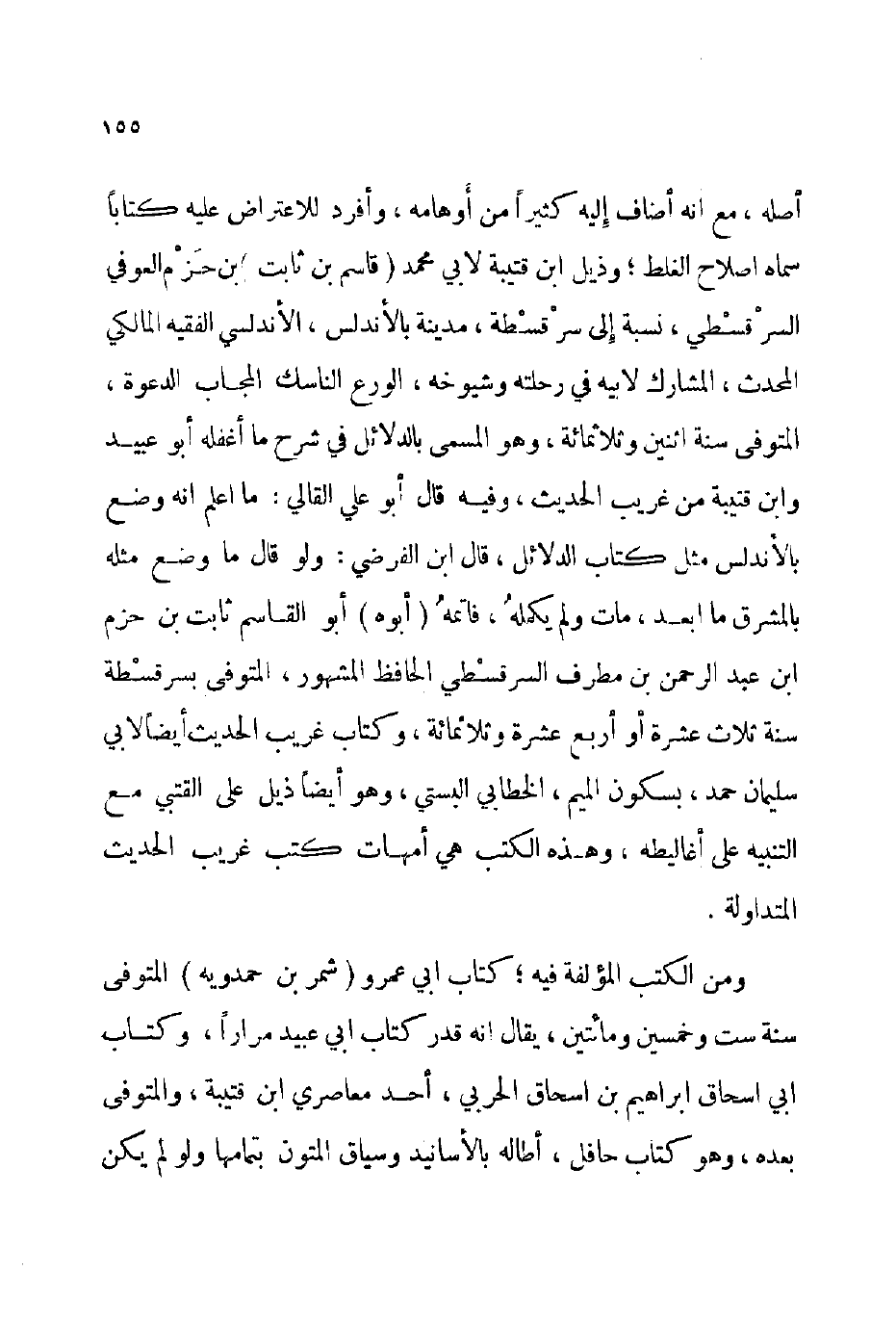 وذيل ابن قتيبة لأبي محمد قاسم بن ثابت بن حزم العوفي السرقسطي نسبة إلى سرقسطة مدينة بالأندلس الأندلسي الفقيه المالكي المحدث المشارك لأبيه في رحلته وشيوخه الورع الناسك المجاب الدعوة المتوفى: سنة اثنين وثلاثمائة وهو المسمى: بالدلائل في شرح ما أغفله أبو عبيد وابن قتيبة من غريب الحديث وفيه قال أبو علي القالي: ما أعلم أنه وضع بالأندلس مثل كتاب الدلائل، قال ابن الفرضي: ولو قال ما وضع مثله بالمشرق ما أبعد مات ولم يكمله فأتمه أبوه أبو القاسم ثابت بن حزم بن عبد الرحمن بن مطرف السرقسطي الحافظ المشهور المتوفى بسرقسطة سنة ثلاث عشرة أو أربع عشرة وثلاثمائة، وكتاب غريب الحديث أيضا لأبي سليمان حمد بسكون الميم الخطابي البستي وهو أيضا ذيل على القتبي مع التنبيه على أغاليطه وهذه الكتب هي أمهات كتب غريب الحديث المتداولة.