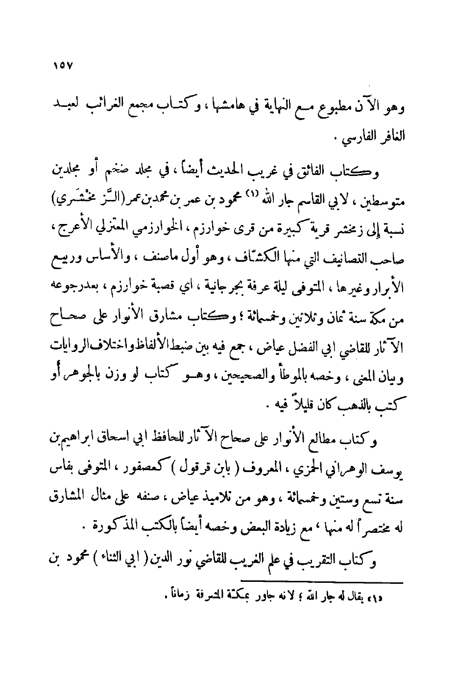 وكتاب الفائق في غريب الحديث أيضا في مجلد ضخم أو مجلدين متوسطين لأبي القاسم جار الله1 محمود بن عمر بن محمد بن عمر الزمخشري نسبة إلى زمخشر قرية كبيرة من قرى خوارزم الخوارزمي المعتزلي الأعرج صاحب التصانيف التي منها: الكشاف وهو أول ما صنف والأساس وربيع الأبرار وغيرها المتوفى: ليلة عرفة بجرجانية أي: قصبة خوارزم بعد رجوعه من مكة سنة ثمان وثلاثين وخمسمائة، وكتاب مشارق الأنوار على صحاح الآثار للقاضي أبي الفضل عياض جمع فيه بين ضبط الألفاظ واختلاف الروايات وبيان المعنى وخصه بالموطأ والصحيحين وهو كتاب لو وزن بالجوهر أو كتب بالذهب كان قليلا فيه.
