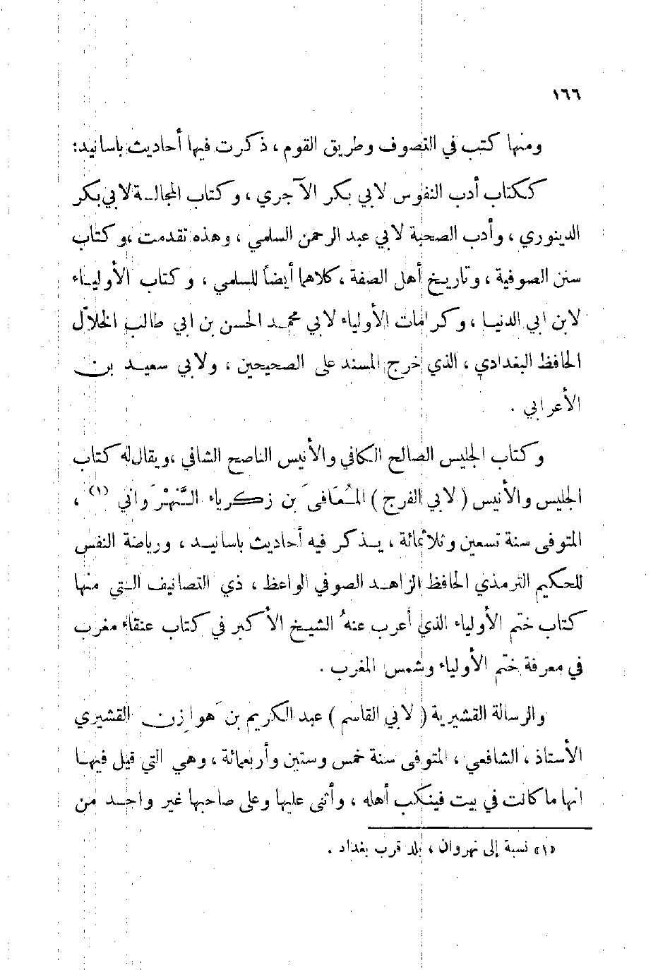 ككتاب أدب النفوس لأبي بكر الآجري وكتاب المجالسة لأبي بكر الدينوري وأدب الصحبة لأبي عبد الرحمن السلمي وهذه تقدمت، وكتاب سنن الصوفية وتاريخ أهل الصفة كلاهما أيضا للسلمي وكتاب الأولياء لابن أبي الدنيا وكرامات الأولياء لأبي محمد الحسن بن أبي طالب الخلال الحافظ البغدادي الذي خرج المسند على الصحيحين ولأبي سعيد بن الأعرابي.