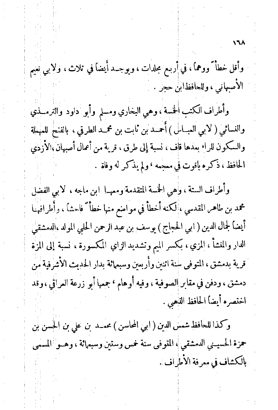 وأطراف الستة وهي الخمسة المتقدمة ومعها ابن ماجة لأبي الفضل محمد بن طاهر المقدسي لكنه أخطأ في مواضع منها خطأ فاحشا، وأطرافها أيضا لجمال الدين أبي الحجاج يوسف بن عبد الرحمن الحلبي المولد الدمشقي الدار والمنشأ المزي بكسر الميم وتشديد الزاي المكسورة نسبة إلى المزة قرية بدمشق المتوفى: سنة اثنين وأربعين وسبعمائة بدار الحديث الأشرفية من دمشق ودفن في مقابر الصوفية وفيه أوهام جمعها أبو زرعة العراقي وقد اختصره أيضا الحافظ الذهبي.