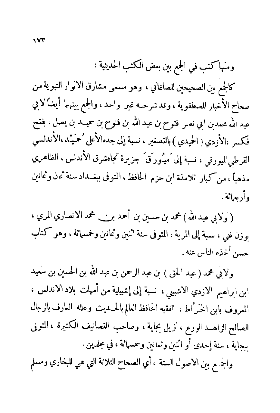 كالجمع بين الصحيحين للصاغاني وهو مسمى: مشارق الأنوار النبوية من صحاح الأخبار المصطفوية وقد شرحه غير واحد والجمع بينهما أيضا لأبي عبد الله محمد بن أبي نصر فتوح بن عبد الله بن فتوح بن حميد بن يصل بفتح فكسر الأزدي الحميدي بالتصغير نسبة إلى جده الأعلى حميد الأندلسي القرطبي الميورقي نسبة إلى ميورق جزيرة تجاه شرق الأندلس الظاهري مذهبا من كبار تلامذة ابن حزم الحافظ المتوفى: ببغداد سنة ثمان وثمانين وأربعمائة.