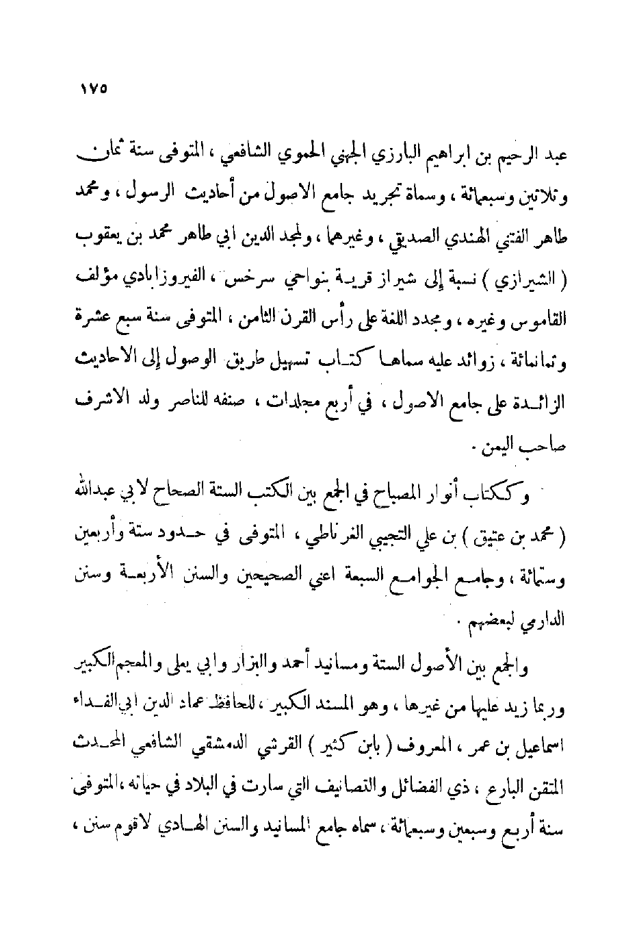 والجمع بين الأصول الستة ومسانيد أحمد والبزار وأبي يعلى والمعجم الكبير وربما زيد عليها من غيرها وهو المسند الكبير للحافظ عماد الدين أبي الفداء إسماعيل بن عمر المعروف: بابن كثير القرشي الدمشقي الشافعي المحدث المتقن البارع ذي الفضائل والتصانيف التي سارت في البلاد في حياته المتوفى: سنة أربع وسبعين وسبعمائة سماه: جامع المسانيد والسنن الهادي لأقوم سنن
