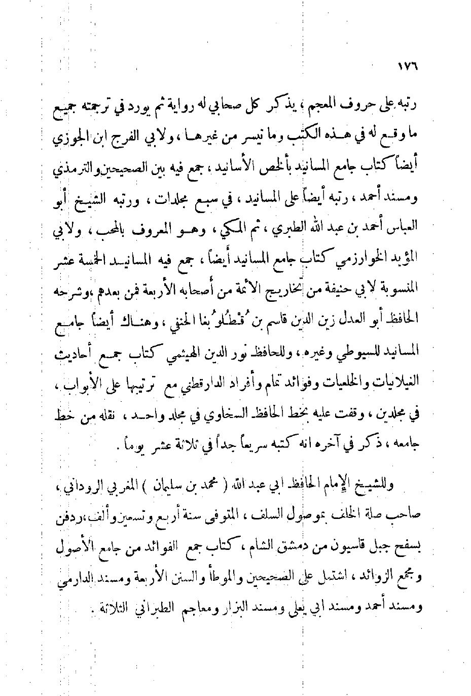 وللشيخ الإمام الحافظ أبي عبد الله محمد بن سليمان المغربي الروداني صاحب صلة الخلف بموصول السلف المتوفى: سنة أربع وتسعين وألف ودفن بسفح جبل قاسيون من دمشق الشام كتاب جمع الفوائد من جامع الأصول ومجمع الزوائد اشتمل على الصحيحين والموطأ والسنن الأربعة ومسند الدارمي ومسند أحمد ومسند أبي يعلى ومسند البزار ومعاجم الطبراني الثلاثة.