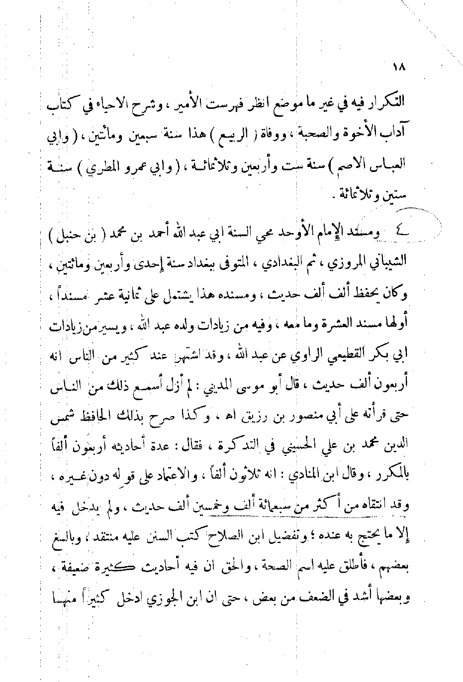 ومسند الإمام الأوحد محي السنة أبي عبد الله أحمد بن محمد بن حنبل الشيباني المروزي ثم البغدادي المتوفى: سنة إحدى وأربعين ومائتين وكان يحفظ ألف ألف حديث ومسنده هذا يشتمل على ثمانية عشر مسندا:
