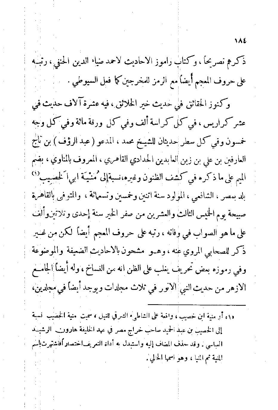 وكنوز الحقائق في حديث خير الخلائق فيه عشرة آلاف حديث في عشر كراريس في كل كراسة ألف وفي كل ورقة مائة وفي كل وجه خمسون وفي كل سطر حديثان للشيخ محمد المدعو عبد الرؤوف بن تاج العارفين بن علي بن زين العابدين الحاجي القاهري المعروف: بالمناوي بضم الميم على ما ذكره في كشف الظنون وغيره نسبة إلى منية أبي الخصيب1 بلد بمصر الشافعي المولود: سنة اثنين وخمسين وتسعمائة والمتوفى: بالقاهرة صبيحة يوم الخميس الثالث والعشرين من صفر الخير سنة إحدى وثلاثين وألف على ما هو الصواب في وفاته رتبه على حروف المعجم أيضا لكن من غير ذكر للصحابي المروي عنه وهو مشحون بالأحاديث الضعيفة والموضوعة وفي رموزه بعض تحريف يغلب على الظن أنه من النساخ وله أيضا الجامع الأزهر من حديث النبي الأنور في ثلاث مجلدات ويوجد أيضا في مجلدين