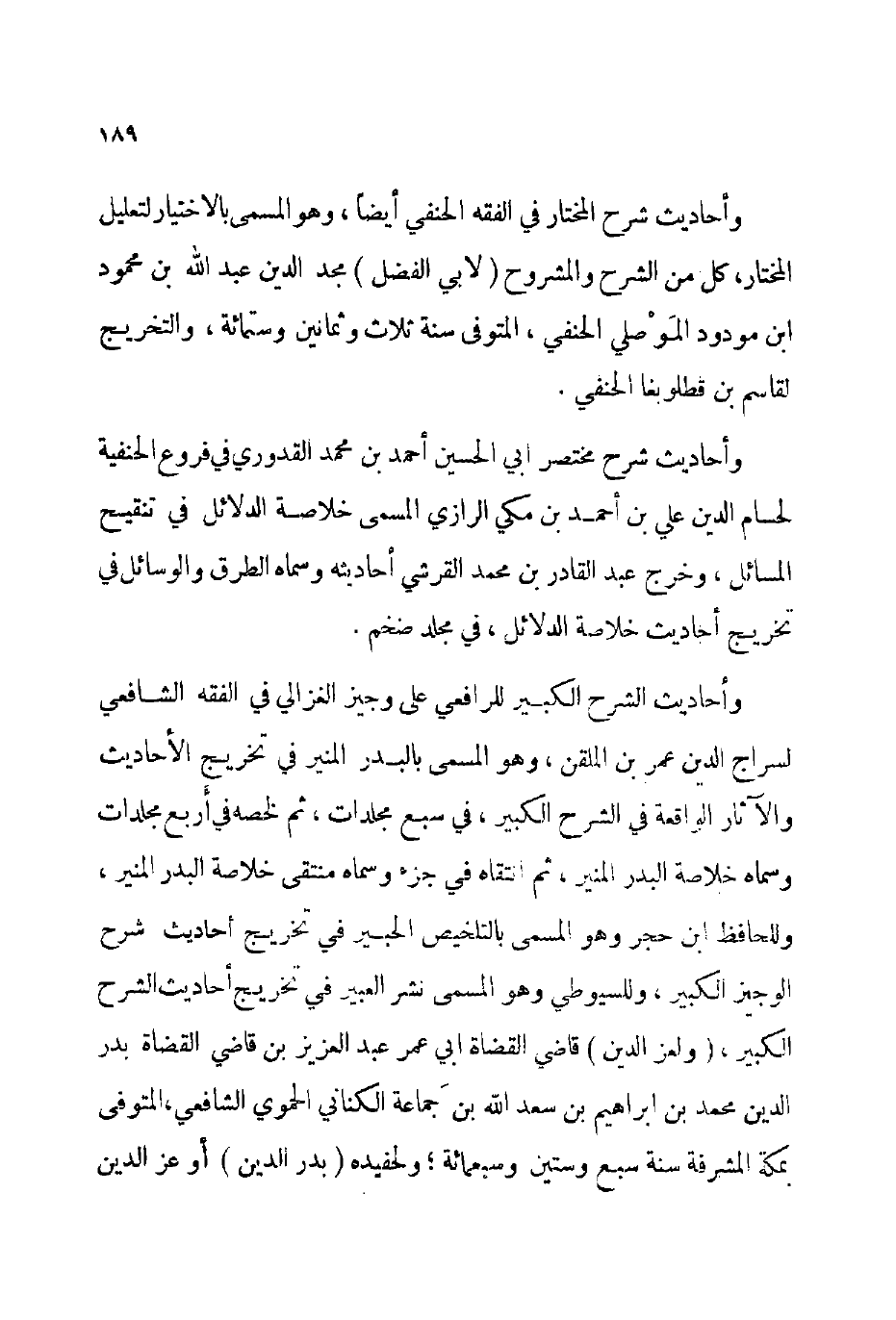 وأحاديث الشرح الكبير للرافعي على وجيز الغزالي في الفقه الشافعي لسراج الدين عمر بن الملقن وهو المسمى: بالبدر المنير في تخريج الأحاديث والآثار الواقعة في الشرح الكبير في سبع مجلدات ثم لخصه في أربع مجلدات وسماه: خلاصة البدر المنير ثم انتقاه في جزء وسماه: منتقى خلاصة البدر المنير وللحافظ ابن حجر وهو المسمى: بالتخليص الحبير في تخريج أحاديث شرح الوجيز الكبير وللسيوطي وهو المسمى: نشر العبير في تخريج أحاديث الشرح الكبير، ولعز الدين قاضي القضاة أبي عمر عبد العزيز بن قاضي القضاة بدر الدين محمد بن إبراهيم بن سعد الله بن جماعة الكناني الحموي الشافعي المتوفى: بمكة المشرفة سنة سبع وستين وسبعمائة ولحفيده بدر الدين أو عز الدين