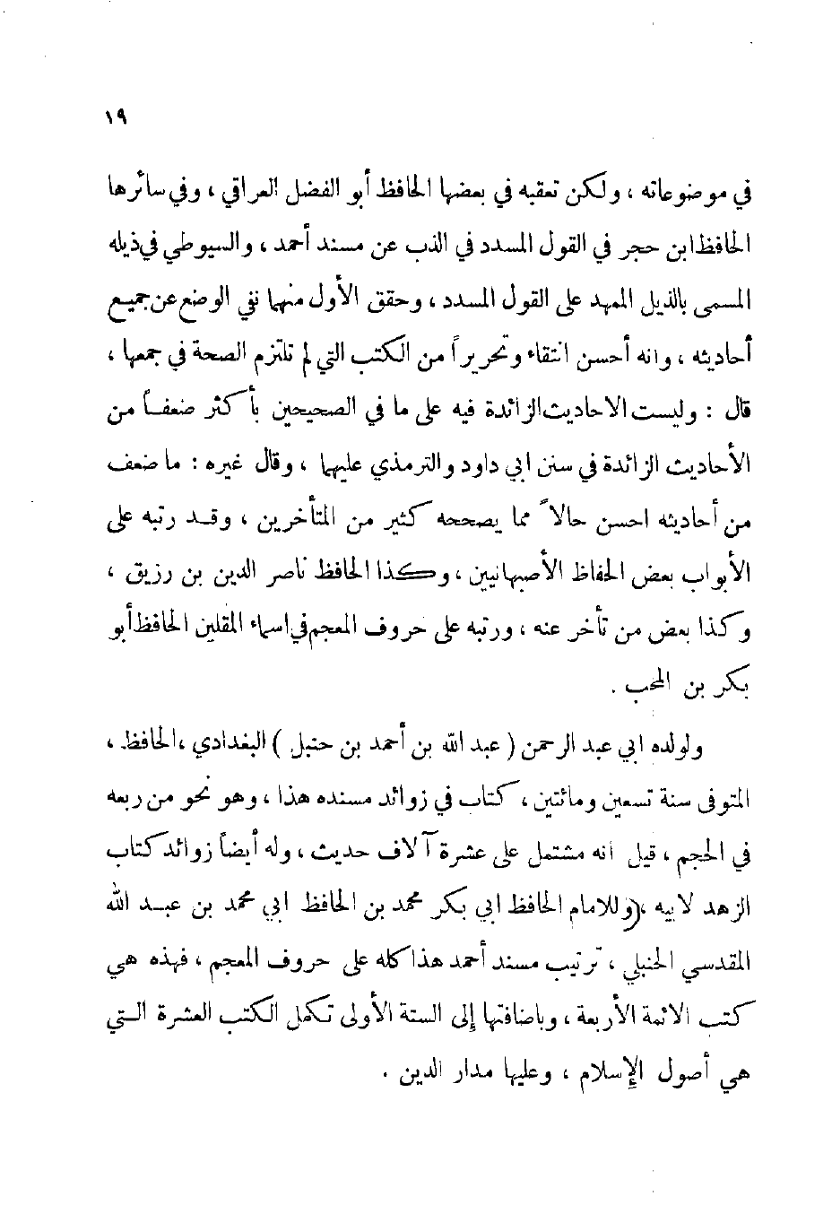 ولولده أبي عبد الرحمن عبد الله بن أحمد بن حنبل البغدادي الحافظ المتوفى سنة تسعين ومائتين كتاب في زوائد مسنده هذا وهو نحو من ربعه في الحجم قيل: أنه مشتمل على عشر آلاف حديث وله أيضا زوائد كتاب الزهد لأبيه وللإمام الحافظ أبي بكر محمد بن الحافظ أبي محمد بن عبد الله المقدسي الحنبلي ترتيب مسند أحمد هذا كله على حروف المعجم فهذه هي كتب الأئمة الأربعة وبإضافتها إلى الستة الأولى تكمل الكتب العشرة التي هي أصول الإسلام وعليها مدار الدين.