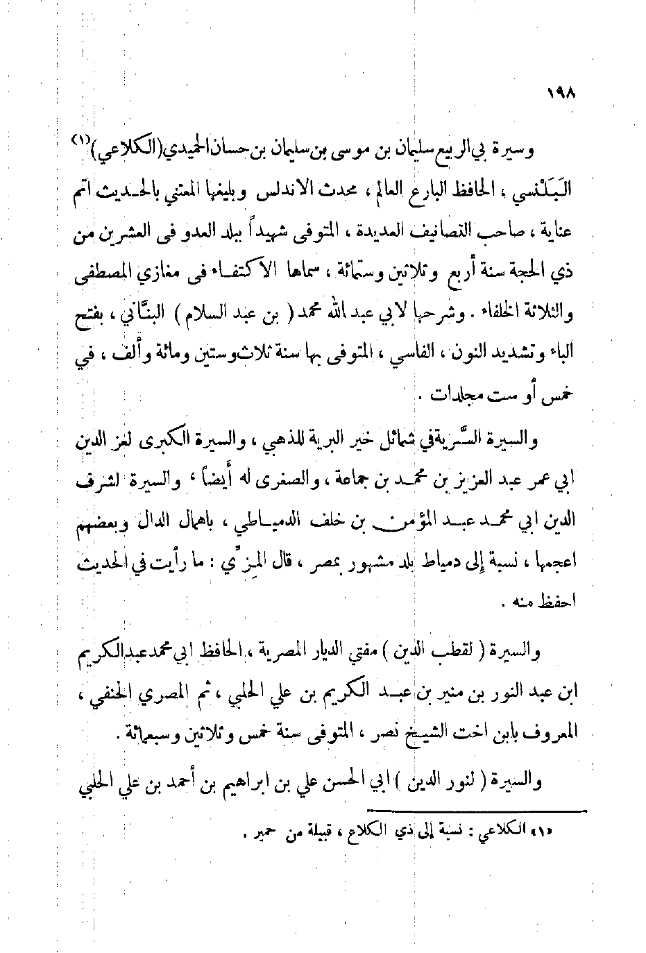 وسيرة أبي الربيع سليمان بن موسى بن سليمان بن حسان الحميدي الكلاعي1 البلنسي الحافظ البارع العالم محدث الأندلس وبليغها المعتني بالحديث أتم عناية صاحب التصانيف العديدة المتوفى شهيدا: ببلد العدو في العشرين من ذي الحجة سنة أربع وثلاثين وستمائة سماها: الاكتفاء في مغازي المصطفى والثلاثة الخلفاء