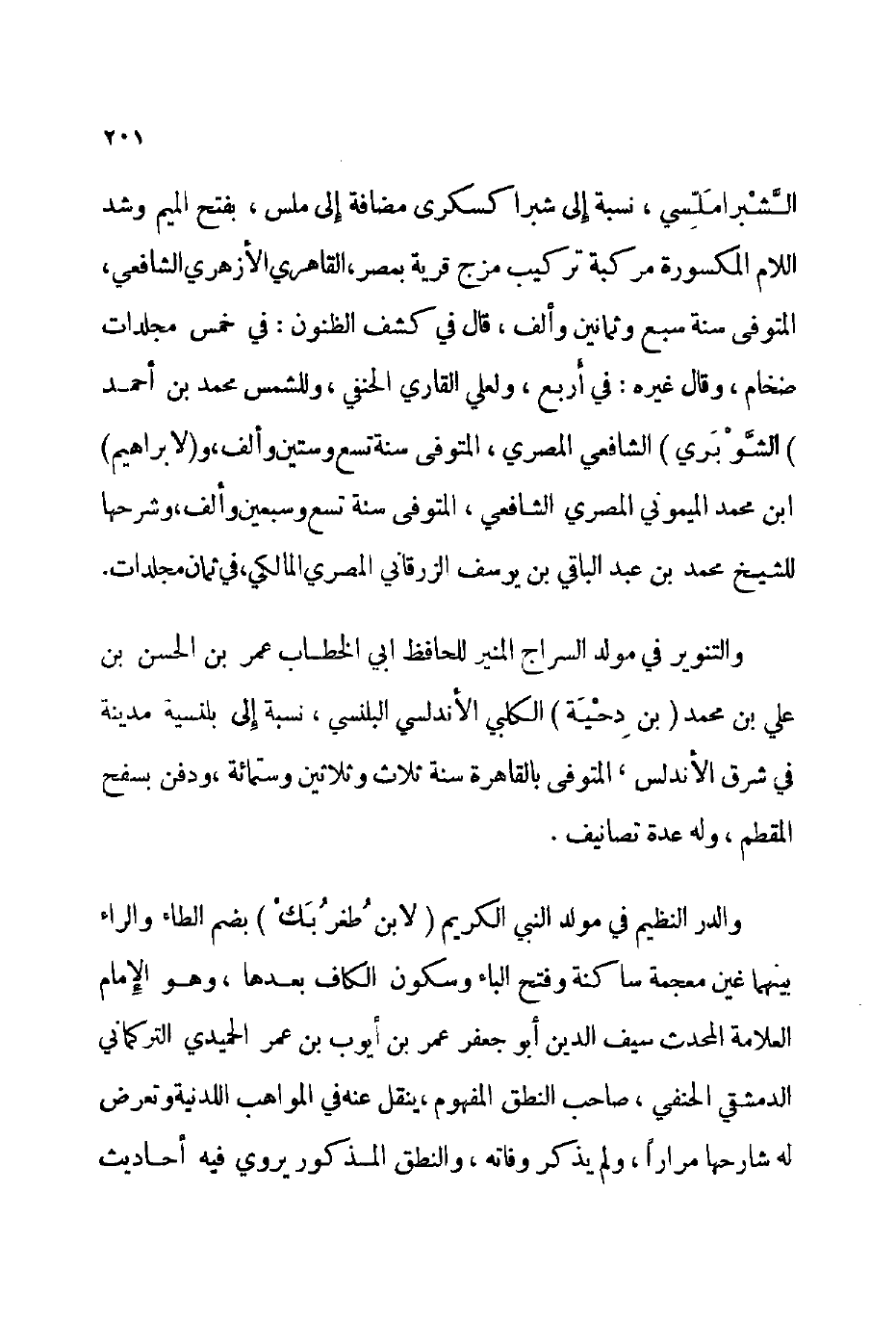 والتنوير في مولد السراج المنير للحافظ أبي الخطاب عمر بن الحسن بن علي بن محمد بن دحية الكلبي الأندلسي البلنسي نسبة إلى بلنسية مدينة في شرق الأندلس المتوفى: بالقاهرة سنة ثلاث وثلاثين وستمائة ودفن بسفح المقطم وله عدة تصانيف.