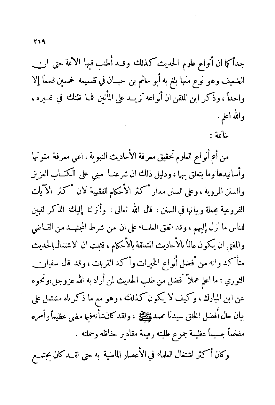 من أهم أنواع العلوم تحقيق معرفة الأحاديث النبوية أعني: معرفة متونها وأسانيدها وما يتعلق بهما ودليل ذلك أن شرعنا مبني على الكتاب العزيز والسنن المروية وعلى السنن مدار أكثر الأحكام الفقهية لأن أكثر الآيات الفروعية مجملة وبيانها في السنن قال الله تعالى: {وَأَنْزَلْنَا إِلَيْكَ الذِّكْرَ لِتُبَيِّنَ لِلنَّاسِ مَا نُزِّلَ إِلَيْهِمْ} ، وقد اتفق العلماء: على أن من شرط المجتهد من القاضي والمفتي أن يكون عالما بالأحاديث المتعلقة بالأحكام فثبت أن الاشتغال بالحديث متأكد وأنه من أفضل أنواع الخيرات وآكد القربات، وقد قال سفيان الثوري: ما أعلم عملا أفضل من طلب الحديث لم أراد به الله عز وجل ونحوه عن ابن المبارك وكيف لا يكون كذلك وهو مع ما ذكرناه مشتمل على بيان حال أفضل الخلق سيدنا محمد صلى الله عليه وسلم ولقد كان شأنه فيما مضى عظيما وأمره مفخما جسيما عظيمة جموع طلبته رفيعة مقادير حفاظه وحملته.