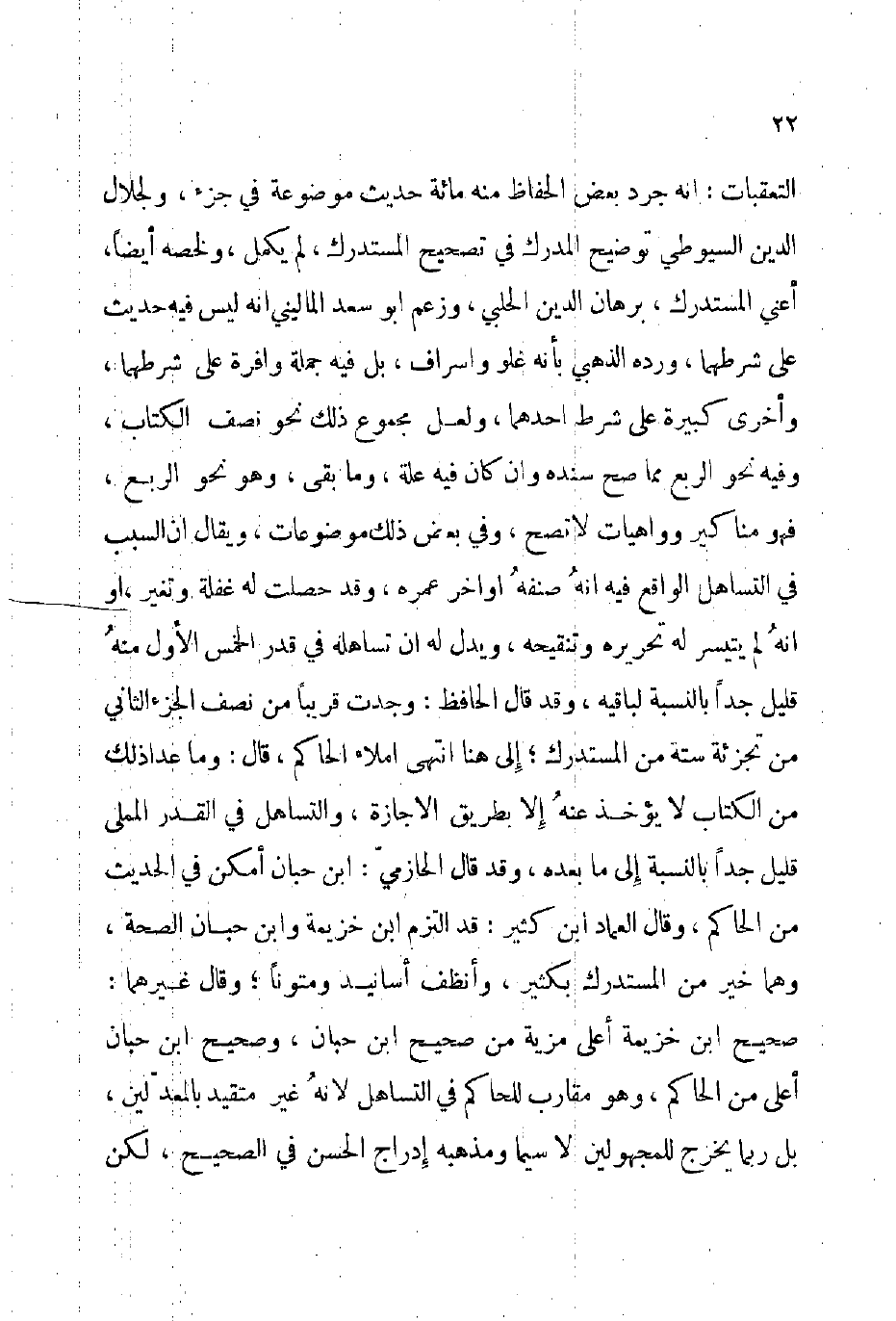 التعقبات: أنه جرد بعض الحفاظ منه مائة حديث موضوعة في جزء ولجلال الدين السيوطي توضيح المدرك في تصحيح المستدرك لم يكمل ولخصه أيضا أعني المستدرك برهان الدين الحلبي وزعم أبو سعد الماليني أنه ليس فيه حديث على شرطهما ورده الذهبي: بأنه غلو وإسراف بل فيه جملة وافرة على شرطهما وأخرى كبيرة على شرط أحدهما ولعل مجموع ذلك نحو نصف الكتاب وفيه نحو الربع مما صح سنده وإن كان فيه علة وما بقي وهو نحو الربع فهو مناكير وواهيات لا تصح وفي بعض ذلك موضوعات ويقال: أن السبب في التساهل الواقع فيه أنه صنفه أواخر عمره وقد حصلت له غفلة وتغير أو أنه لم يتيسر له تحريره وتنقيحه ويدل له أن تساهله في قدر الخمس الأول منه قليل جدا بالنسبة لباقيه وقد قال الحافظ: وجدت قريبا من نصف الجزء الثاني من تجزئة ستة من المستدرك إلى هنا انتهى إملاء الحاكم قال: وما عدا ذلك من الكتاب لا يؤخذ عنه إلا بطريق الإجازة والتساهل في القدر المملى قليل جدا بالنسبة إلى ما بعده وقد قال الحازمي: ابن حبان أمكن في الحديث من الحاكم وقال العماد ابن كثير: قد التزم ابن خزيمة وابن حبان الصحة وهما خير من المستدرك بكثير وأنظف أسانيد ومتونا وقال غيرهما: صحيح ابن خزيمة أعلى مزية من صحيح ابن حبان وصحيح ابن حبان أعلى من الحاكم وهو مقارب للحاكم في التساهل لأنه غير متقيد بالمعدلين بل ربما يخرج للمجهولين لا سيما ومذهبه إدراج الحسن في الصحيح لكن