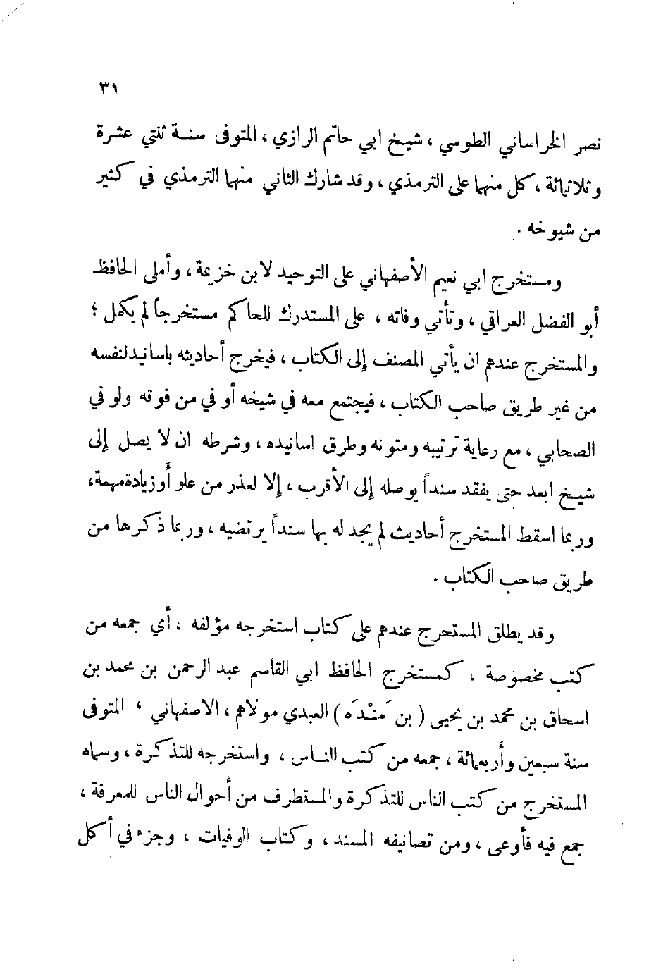 ومستخرج أبي نعيم الأصفهاني على التوحيد لابن خزيمة وأملى الحافظ أبو الفضل العراقي وتأتي وفاته على المستدرك للحاكم مستخرجا لم يكمل والمستخرج عندهم أن يأتي المصنف إلى الكتاب فيخرج أحاديثه بأسانيد لنفسه من غير طريق صاحب الكتاب فيجتمع معه في شيخه أو في من فوقه ولو في الصحابي مع رعاية ترتيبه ومتونه وطرق أسانيده وشرطه أن لا يصل إلى شيخ أبعد حتى يفقد سندا يوصله إلى الأقرب إلا لعذر من علو أو زيادة مهمة وربما أسقط المستخرج أحاديث لم يجد له بها سندا يرتضيه وربما ذكرها من طريق صاحب الكتاب.