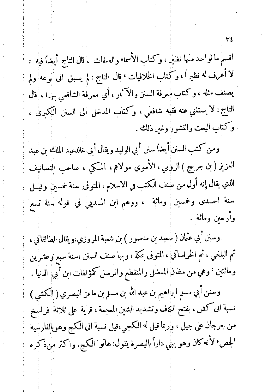 ومن كتب السنن أيضا سنن أبي الوليد ويقال أبي خالد عبد الملك بن عبد العزيز بن جريج الرومي الأموي مولاهم المكي صاحب التصانيف الذي يقال: إنه أول من صنف الكتب في الإسلام المتوفى: سنة خمسين وقيل: سنة إحدى وخمسين ومائة ووهم ابن المديني في قوله: سنة تسع وأربعين ومائة.
