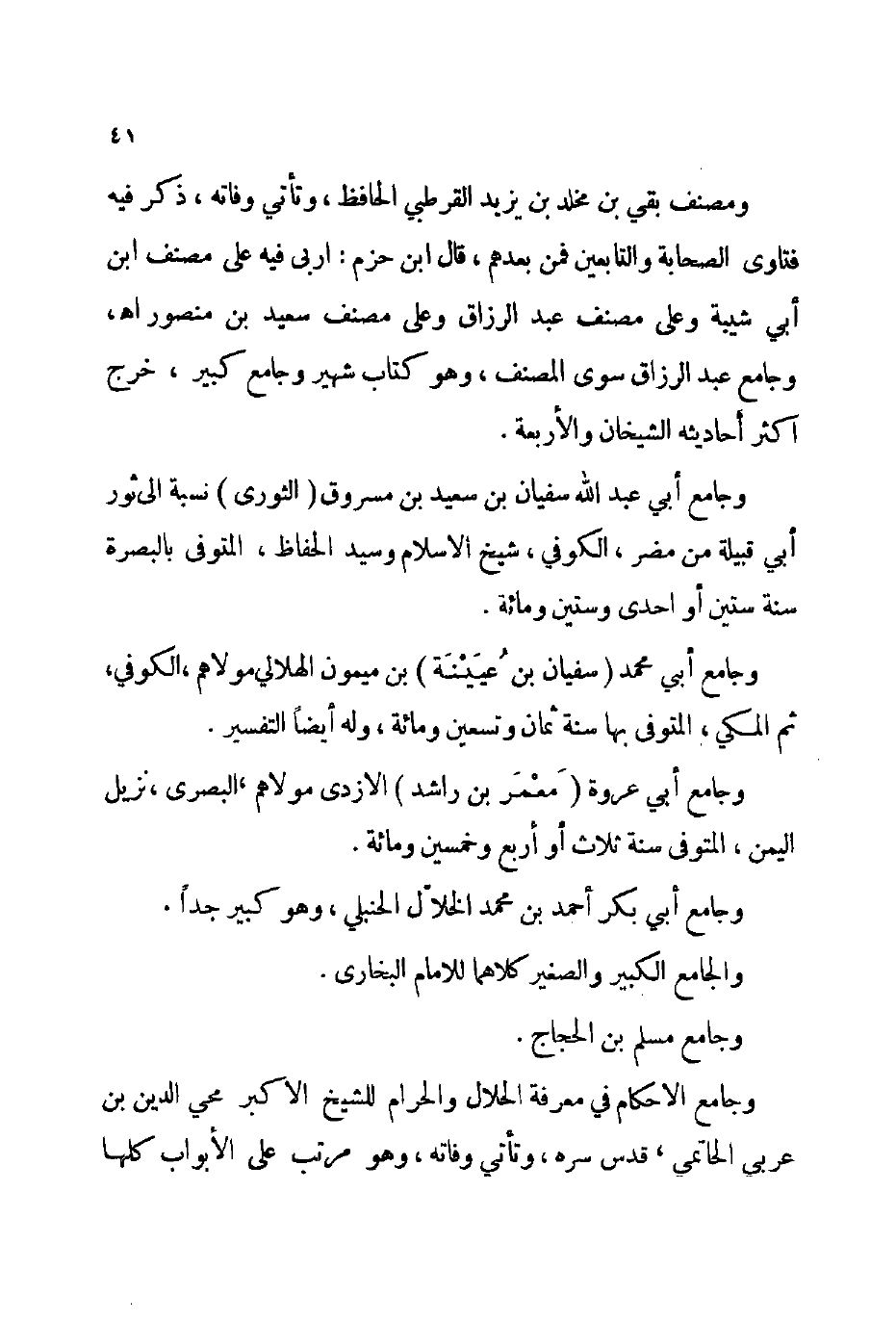 ومصنف بقي بن مخلد بن يزيد القرطبي الحافظ وتأتي وفاته ذكر فيه فتاوى الصحابة والتابعين فمن بعدهم قال ابن حزم: أربى فيه على مصنف ابن أبي شيبة وعلى مصنف عبد الرزاق وعلى مصنف سعيد ابن منصور اهـ. وجامع عبد الرزاق سوى المصنف وهو كتاب شهير وجامع كبير خرج أكثر أحاديثه الشيخان والأربعة.