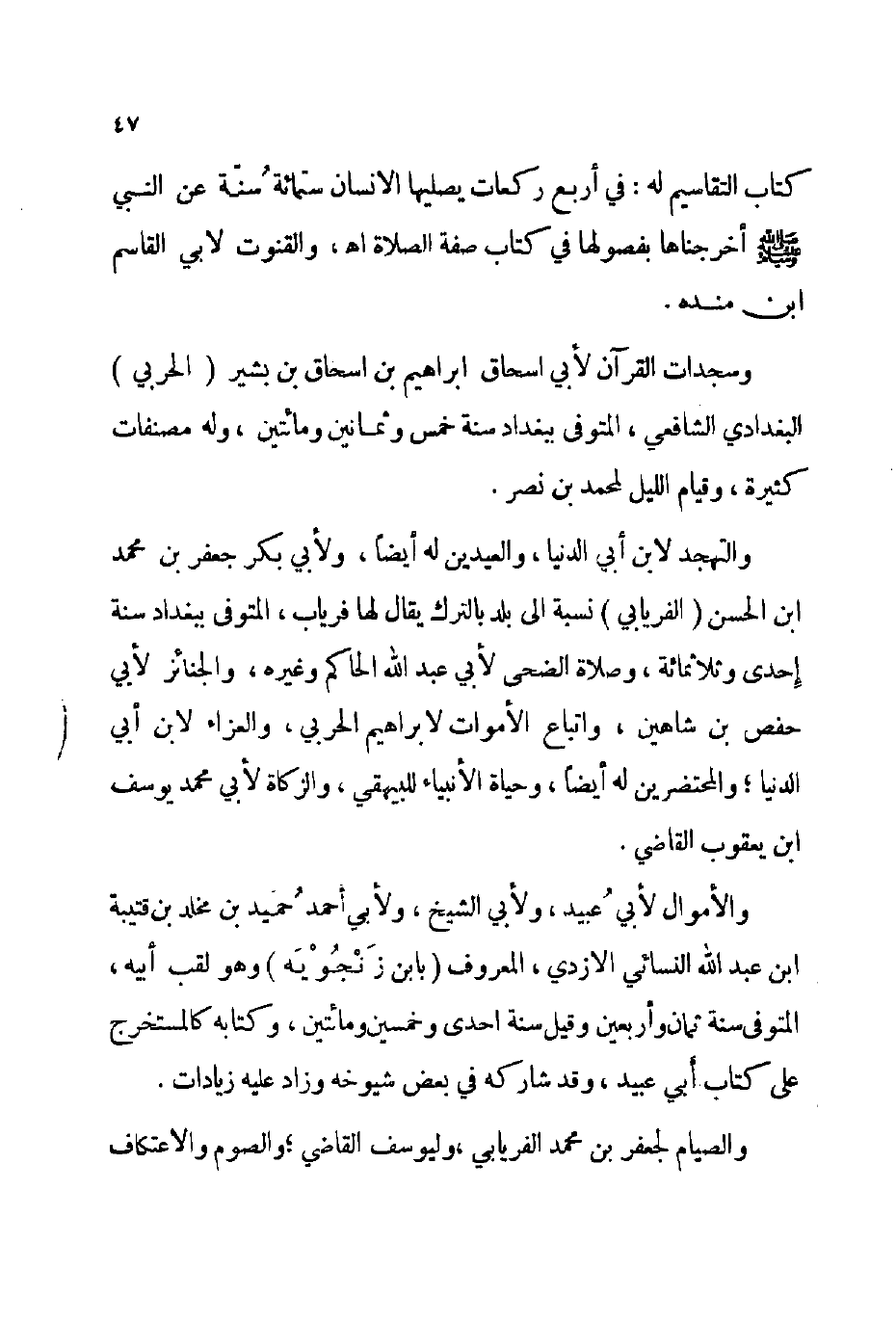 وسجدات القرآن لأبي إسحاق إبراهيم بن إسحاق بن بشير الحربي البغدادي الشافعي المتوفى: ببغداد سنة خمس وثمانين ومائتين وله مصنفات كثيرة وقيام الليل لمحمد بن نصر.
