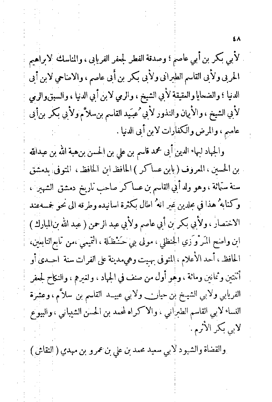 ولأبي بكر ابن أبي عاصم ولأبي عبد الرحمن عبد الله بن المبارك بن واضح المروزي الحنظلي مولى بني حنظلة التميمي من تابع التابعين الحافظ أحد الأعلام المتوفى: بهيت وهي مدينة على الفرات سنة إحدى أو أثنتين وثمانين ومائة وهو أول من صنف في الجهاد ولغيرهم والنكاح لجعفر الفريابي ولأبي الشيخ ابن حيان ولأبي عبيد القاسم بن سلام وعشرة النساء لأبي القاسم الطبراني والإكراه لمحمد بن الحسن الشيباني والبيوع لأبي بكر الأثرم.